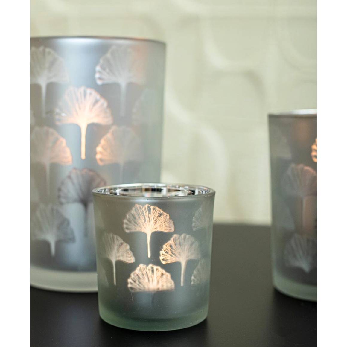 Das Windlicht ist aus Glas gefertigt und hat einen Ginkgo-Blatt-Druck.