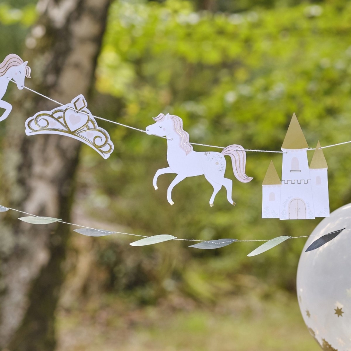 Goldfarbene Wimpelkette mit Prinzessinnen, Schlössern, Pferden und Sternschnuppen, perfekt für Geburtstage, Prinzessinnenpartys oder Themenfeiern, und wird mit einer passenden 2 Meter langen Blättergirlande geliefert, wodurch eine komplette und zauberhafte Dekoration entsteht.