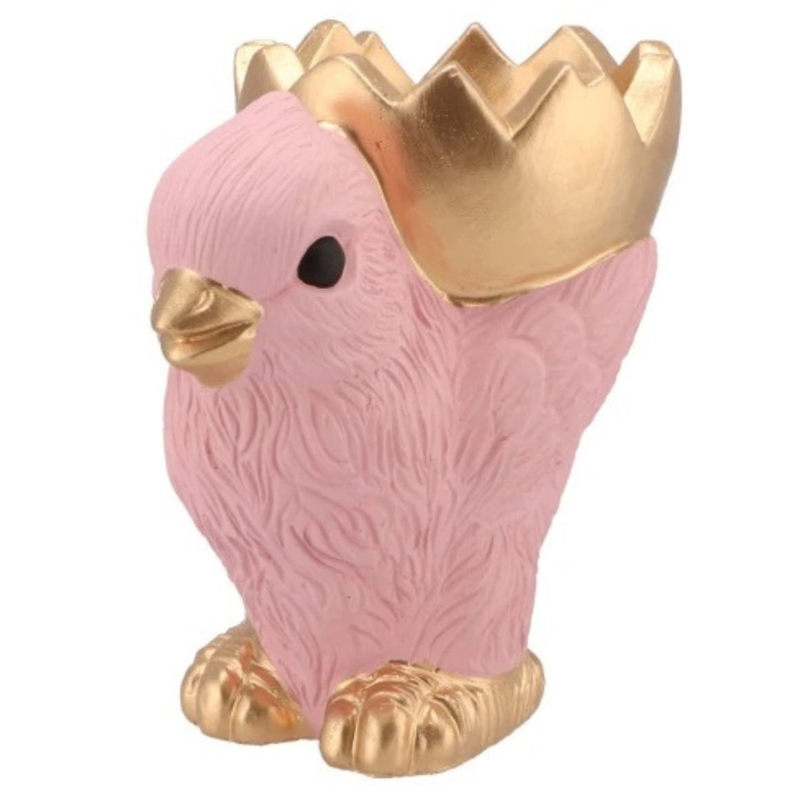 Statue eines Kükens mit einer goldenen Schale auf dem Rücken in Form einer Eierschale.