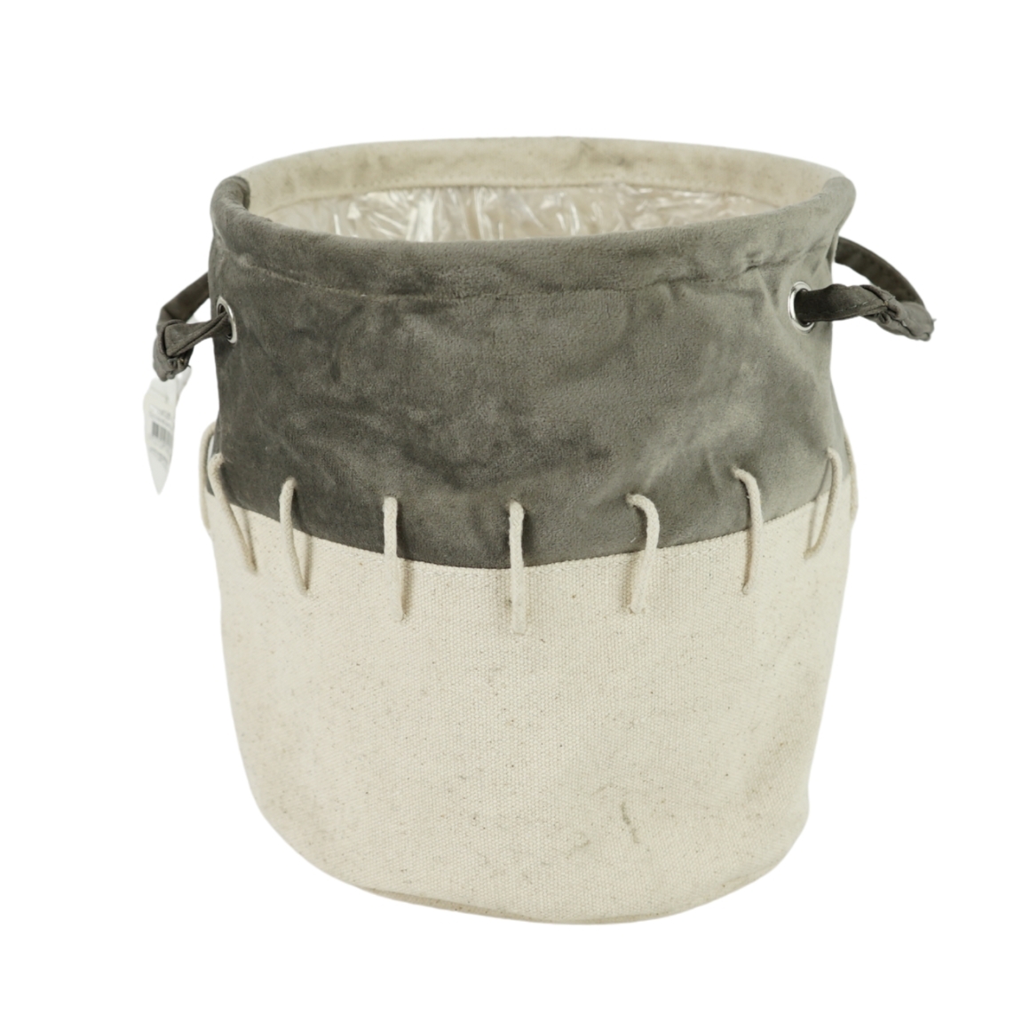 Dekorativer Korb mit Kunststoffauskleidung, geeignet für Pflanzen oder als Zierkorb. Ausgeführt in zwei Farben mit weicher Oberfläche. Ausgestattet mit Griffen und Zierkordel. Die angegebenen Maße beinhalten nicht den Griff.