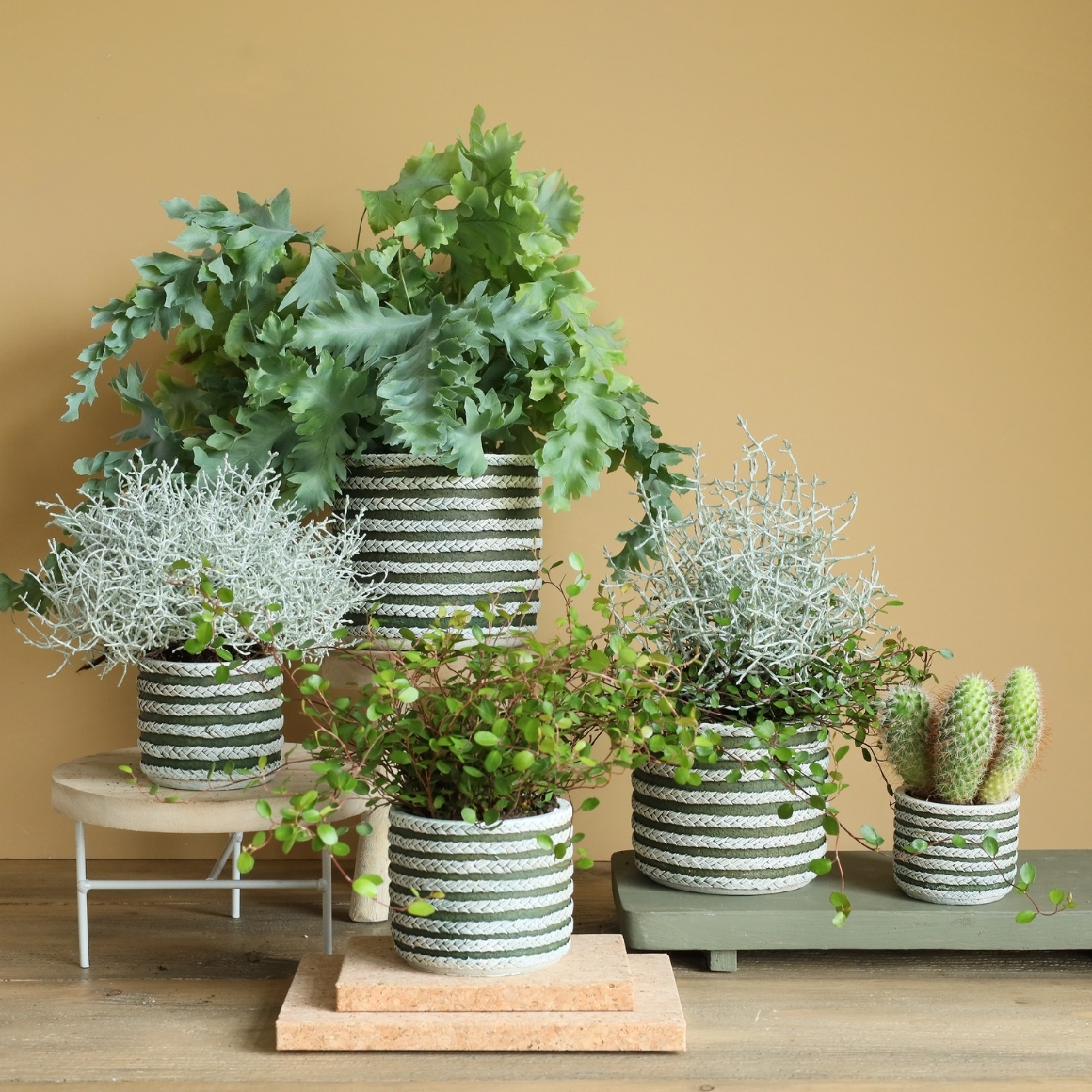 Blumentopf aus der Serie Raf, hergestellt aus Zement mit grüner Oberfläche und dekorativem Muster. Mit einem Durchmesser von ca. 7,5 cm ideal für kleine Pflanzen oder Sukkulenten. Das robuste Material macht den Topf für den Innenbereich geeignet, auf Fensterbank, Tisch oder Regal.