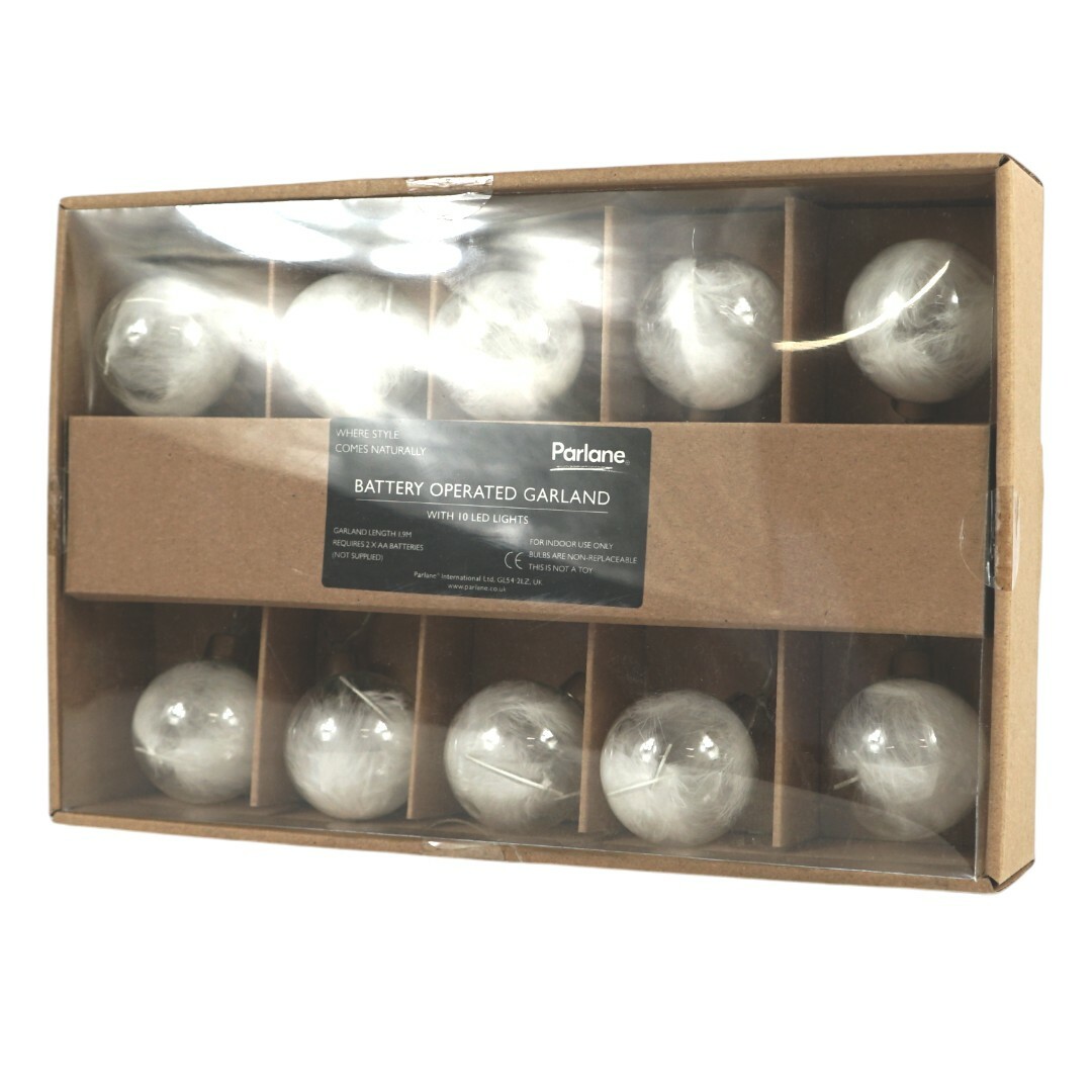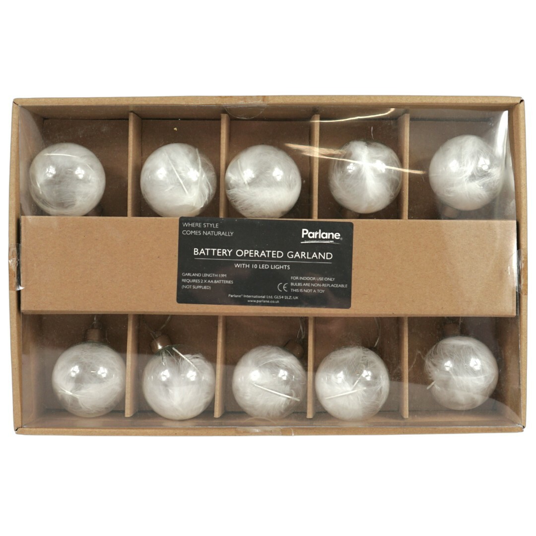 Diese Parlane Lichterkette von 190 cm hat 10 LED-Lampen in transparenten Kugeln von 5 cm, gefüllt mit weißen Federn. Die stimmungsvolle Beleuchtung ist für den Innenbereich geeignet und funktioniert mit 2 x AA-Batterien (nicht enthalten). Ideal als dekorative Beleuchtung für Wohn- oder Festdekoration.