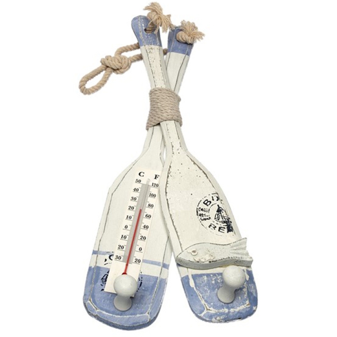 Dekoratives Holzthermometer in Form von zwei Ruderpaddeln mit maritimem Design. In Weiß und Blau gestaltet, mit Seildetail und zwei Haken unten. Für den Innenbereich geeignet. Ein funktionales und stilvolles Accessoire für eine Strand- oder Küsteneinrichtung. Höhe 37 cm.
