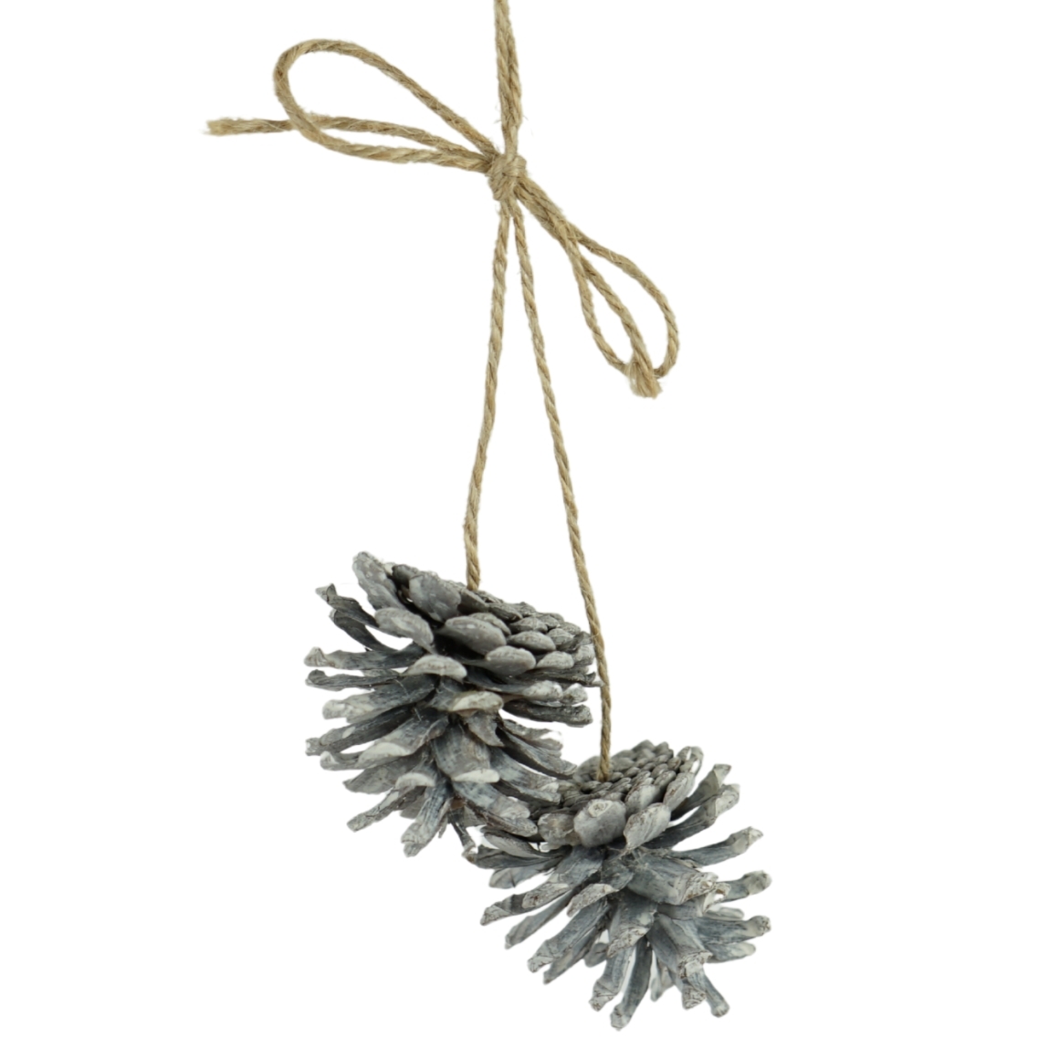 Natürlicher Weihnachtsanhänger mit zwei Zapfen an einer Juteschnur. Die Zapfen sind ca. 5 cm gross und haben eine leichte Schneeschicht für eine winterliche Optik. Masse ohne Schnur.
