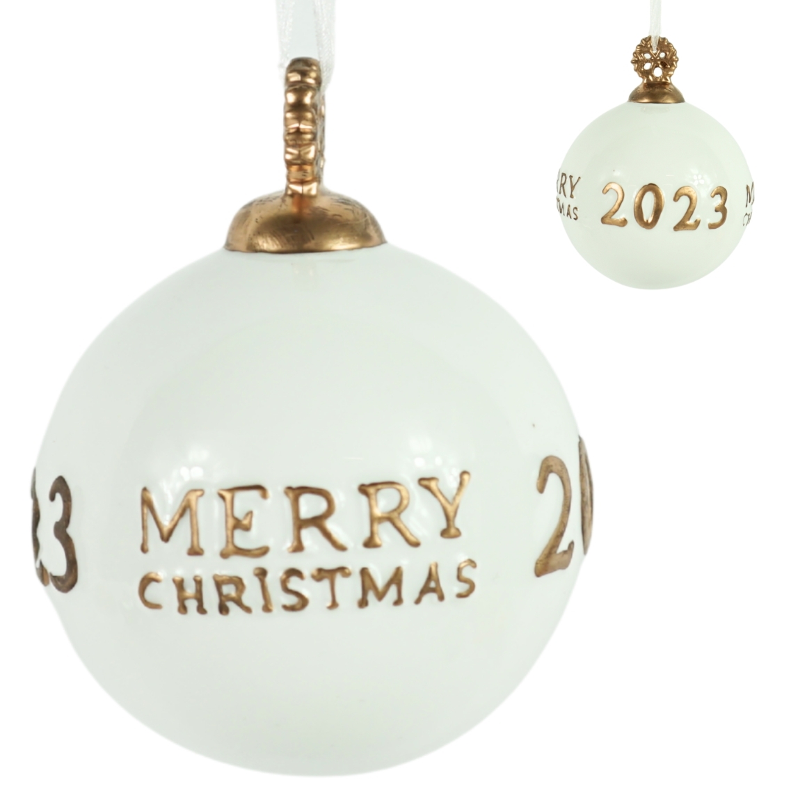 Weiße Porzellan-Weihnachtskugel mit goldfarbener Aufschrift Merry Christmas 2023 . Die Kugel ist 11 cm hoch und mit einem weißen Band zum Aufhängen versehen. Angegebene Maße sind ohne Kordel.