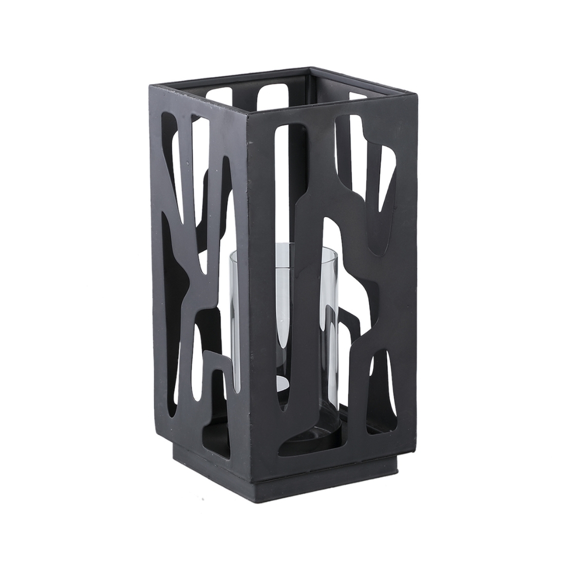 Das PTMD Windlicht Dewey in Schwarz ist eine stilvolle Dekoration mit ausgeschnittener Metallhuelle und Glaseinsatz. Die offene Struktur laesst das Kerzenlicht sanft durchscheinen und sorgt fuer eine warme, stimmungsvolle Atmosphaere. Ideal fuer moderne Einrichtungen.