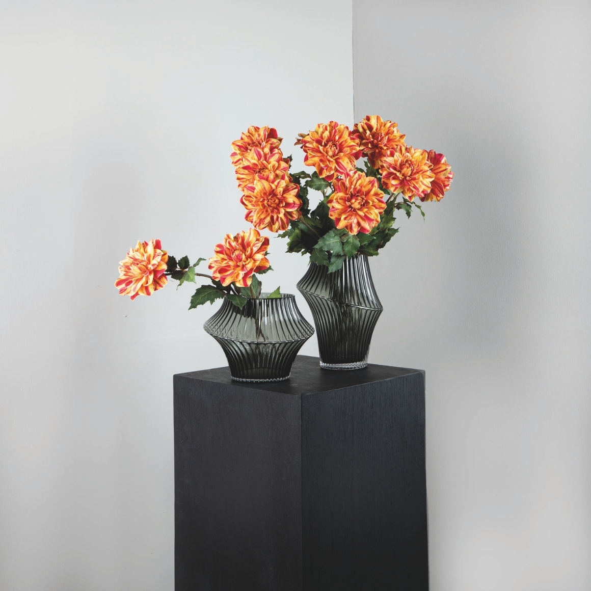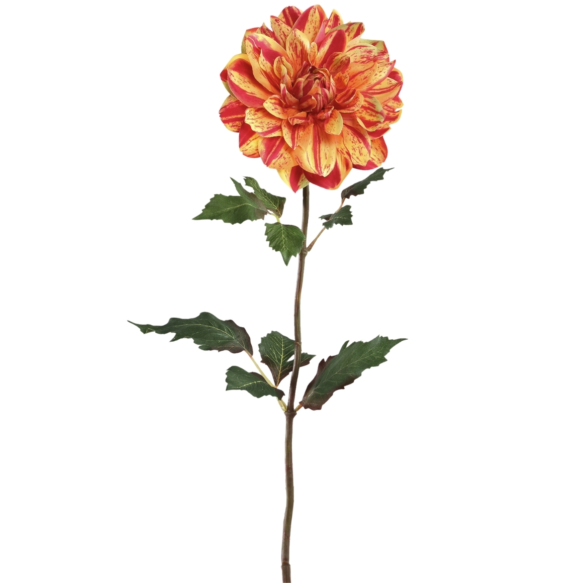 Kunstblume von PTMD mit einer wunderschönen Dahlie in warmen Gelb- und Rottönen. Die Blume ist ca. 73 cm lang und eignet sich perfekt als einzelner Blickfang in einer Vase oder als Teil eines größeren Arrangements.