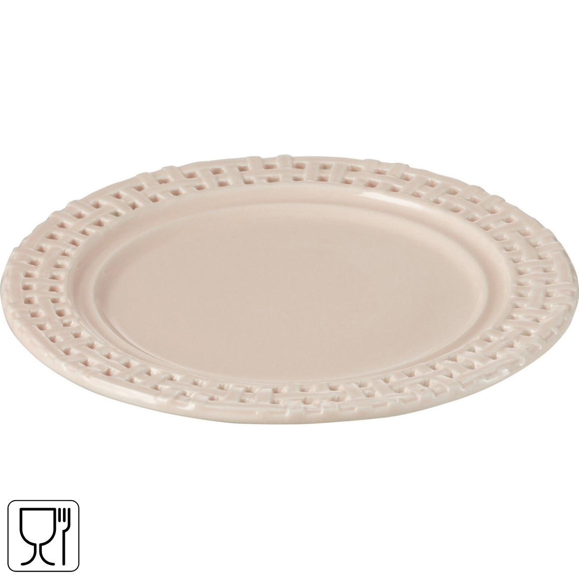 Charmanter rosa Teller von J-Line mit 20 cm Durchmesser. Das dekorative Randmuster sorgt für einen romantischen, eleganten Look. Aus langlebiger Keramik gefertigt. Nicht spülmaschinen-, ofen- oder mikrowellengeeignet.