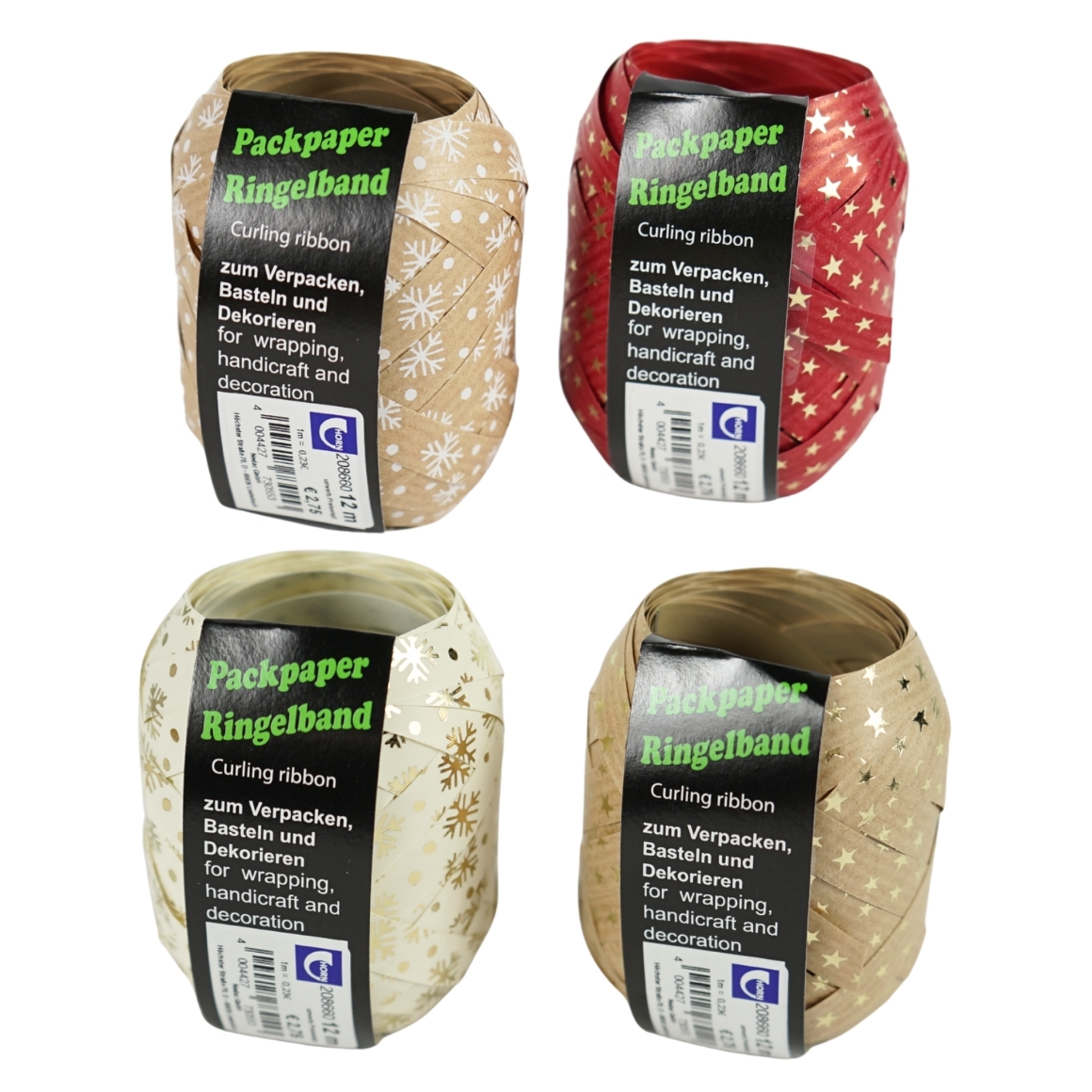 Dieses Papier-Geschenkband von Horn mit Weihnachtsmuster kombiniert Kraftpapier, Rot und Weiss für eine festliche Optik. Ideal zum Verpacken von Geschenken oder für Dekorationen. Das Display enthält 20 Rollen à 12 Meter, aufgeteilt in 4 Designs mit je 5 Rollen.