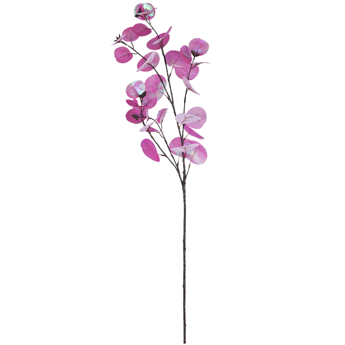 Kunstzweig Eukalyptus in Lila mit einer Länge von 81 cm. Der Zweig hat runde Blätter mit einem dezenten Glanz und lässt sich ideal mit anderen Kunstblumen kombinieren oder in einer stilvollen Vase arrangieren. Pflegeleicht und immer schön, kein Wasser oder Aufwand erforderlich.