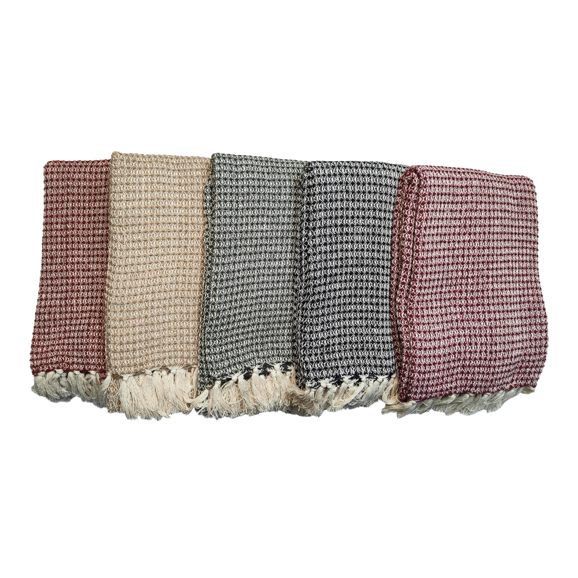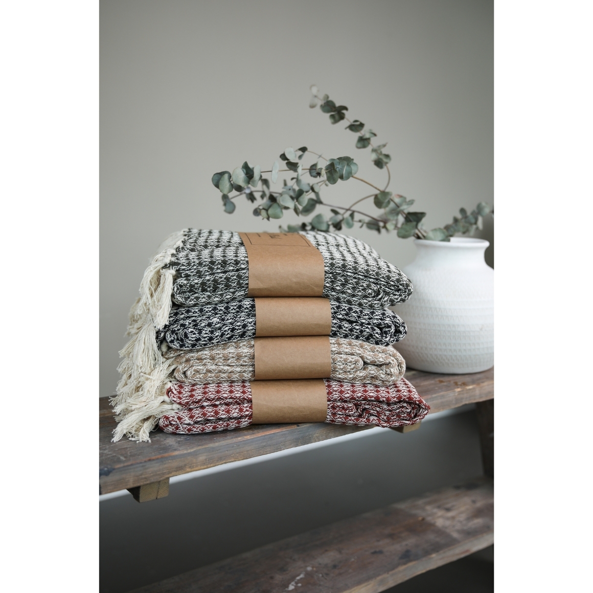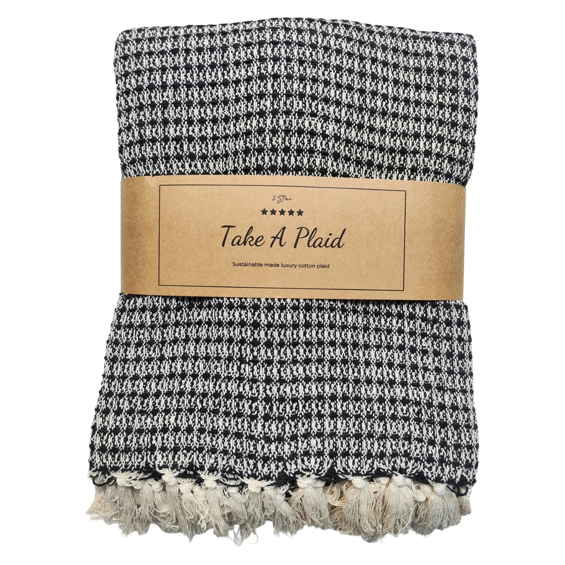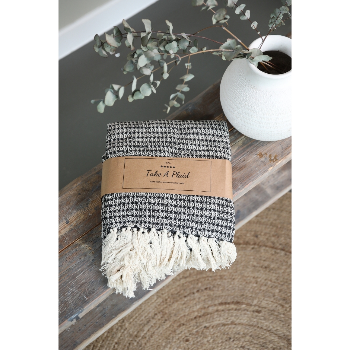 Plaid der Marke Take a Plaid, hergestellt aus nachhaltiger, recycelter Baumwolle. Das Plaid hat Fransen und eine Größe von 130 x 180 cm.