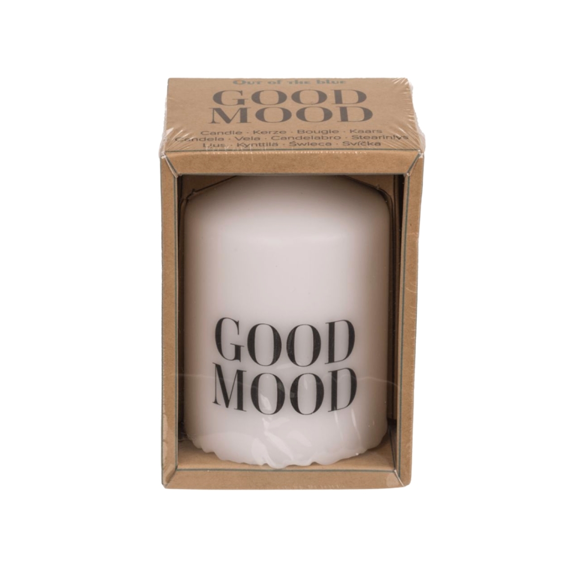 Diese Stumpenkerze von Out of the Blue mit dem Aufdruck Good Mood sorgt sofort für Gemütlichkeit. Die Kerze hat eine Brenndauer von etwa 22 Stunden und wird in einer Kraftverpackung geliefert, ideal als Geschenk.