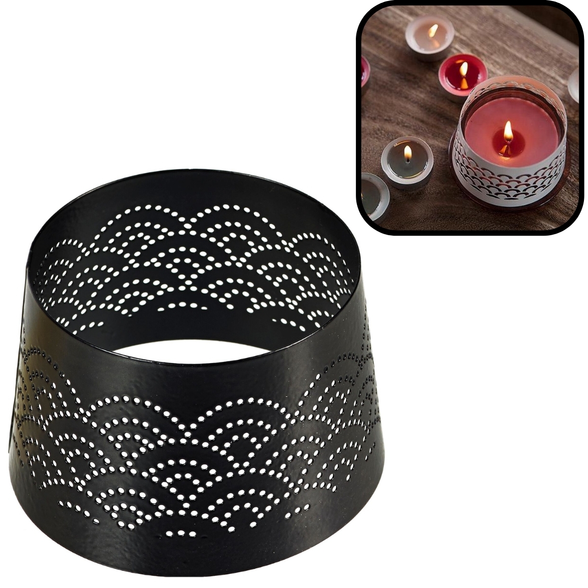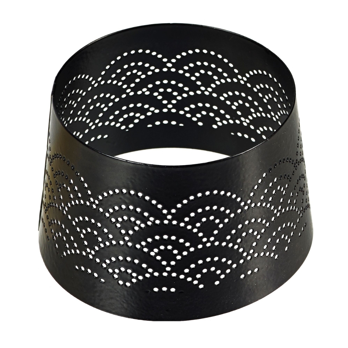 Schwarzes Schirmchen aus Metall mit Lace Design. Durchmesser oben Ø 8,5 cm und unten Ø 7 cm. Erzeugt ein dekoratives Lichtmuster und passt zu stimmungsvoller Tischdekoration. Wiederverwendbar.