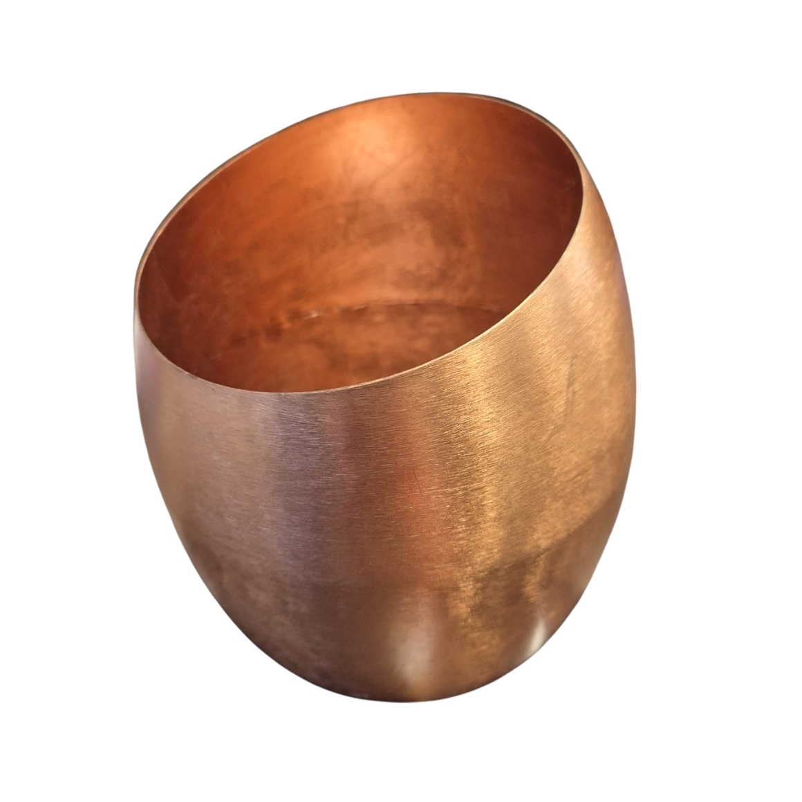 Metall-Teelichthalter in Eiform mit einer warmen goldfarbigen Oberfläche. Das gebürstete Innere erzeugt einen stimmungsvollen Lichteffekt, wenn ein Teelicht darin brennt. Ideal als dekorativer Akzent auf Tisch oder Kommode.