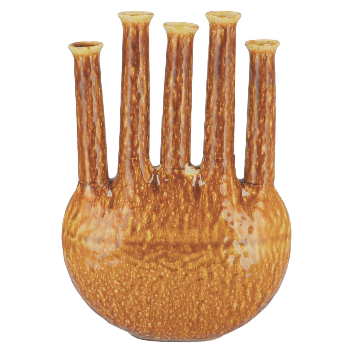 Keramikvase aus der Serie Inga Jahra von Daan Kromhout. Handgefertigtes Modell mit mehreren Halsoeffnungen und melierter Glasur in braunem Farbton. Geeignet als dekoratives Objekt oder fuer einzelne Blumen. Die Vase sollte wasserdicht sein, aber beim Einfuellen von Wasser vorsichtig sein.