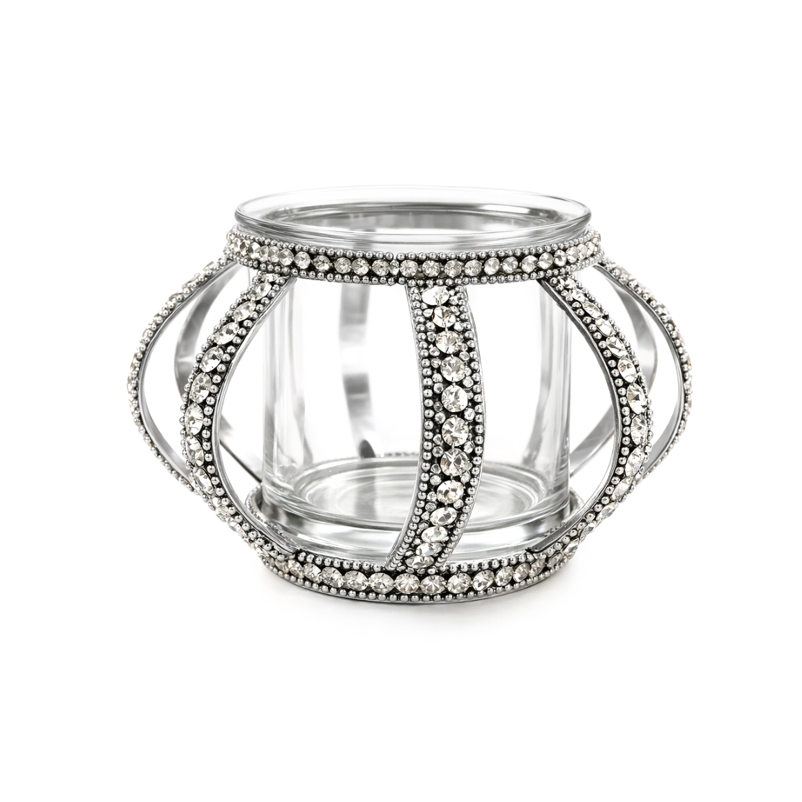 Metall Teelichthalter in silberfarbiger Ausfuhrung mit Glaseinsatz von circa 7 x 9 cm. Die offene Konstruktion ist mit Imitation Edelsteinen verziert und sorgt fur eine dekorative Optik. Geeignet fur Standard Teelichter und ideal als stimmungsvolle Dekoration auf Tisch, Sideboard oder bei einer festlichen Prasentation.