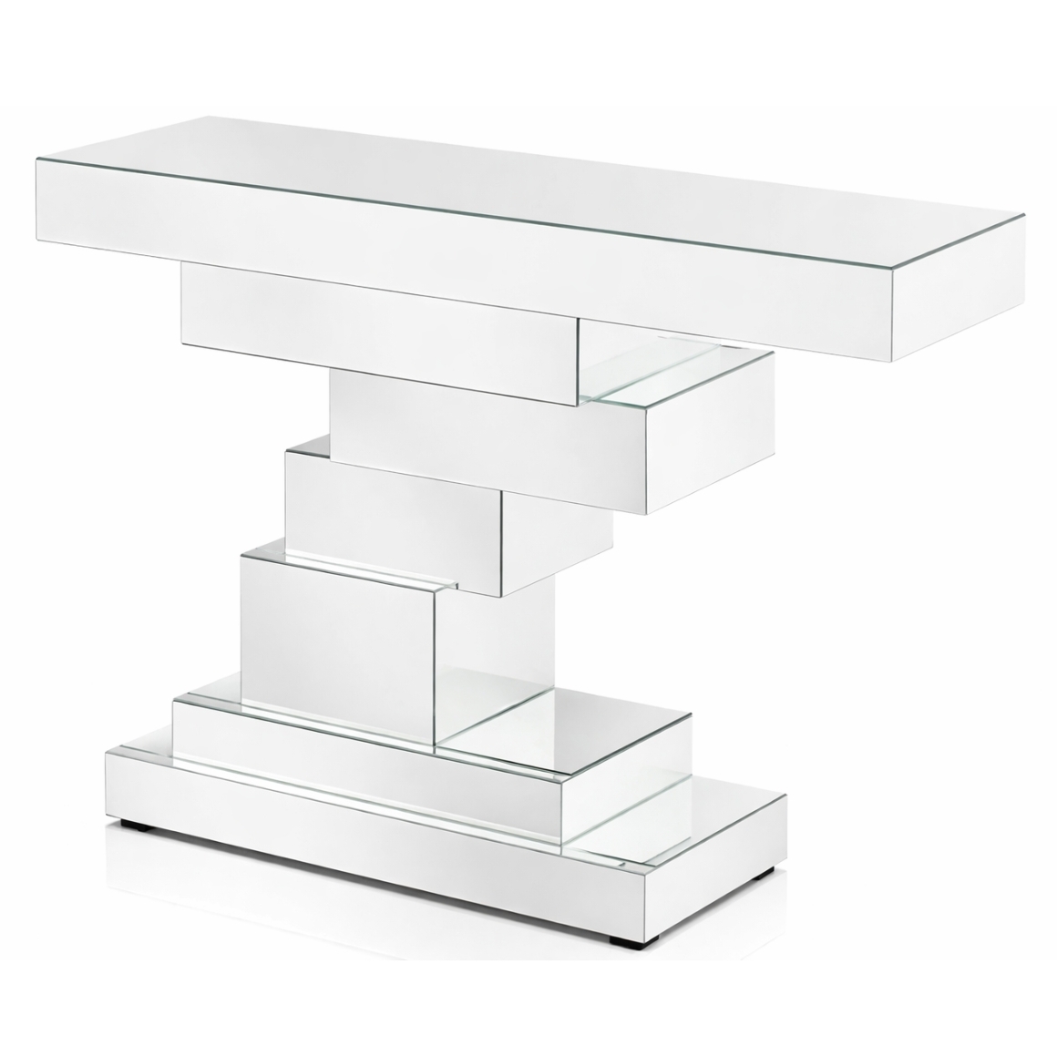 Len-Fra Design Konsole Jacob mit einer Breite von 119 cm, Hoehe von 80 cm und Tiefe von 33 cm. Ausgefuehrt in voll verspiegeltem Design mit klaren Linien und Glaselementen. Geeignet als Konsolentisch fuer Flur, Wohnzimmer oder Eingangsbereich. Das stufenfoermige Untergestell verleiht der Konsole eine moderne Optik und sorgt fuer stabile Platzierung.