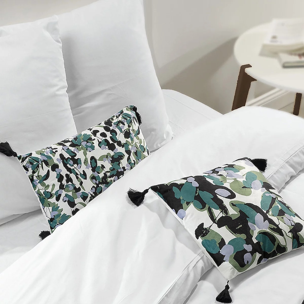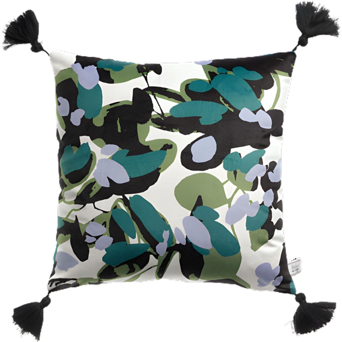 Dekokissen der Marke Ateliers du Linge mit den Massen 40 x 40 cm und Fransen an den Ecken. Velvet Bezug mit Druck auf der Vorderseite und einfarbiger weisser Ruckseite. Die Kombination aus grunen und violetten Details sorgt fur eine dekorative Optik. Mit Reissverschluss ausgestattet. Waschbar bis 40 Grad.
