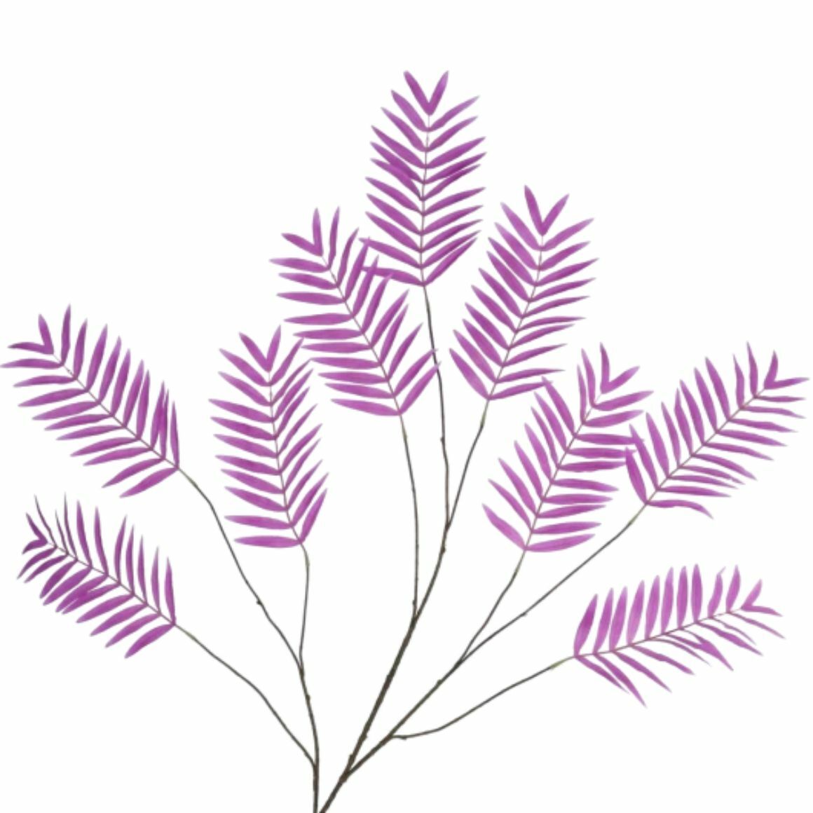 Der Kunstzweig Palm Leaf von Daan Kromhout hat feine Palmblätter in auffaelliger lila Farbe. Die schlanken Verzweigungen sorgen fuer eine luftige und dekorative Wirkung. Der leicht biegsame Stiel laesst sich einfach in Form bringen fuer verschiedene Arrangements. Geeignet fuer hohe Vasen, Gestecke oder Kombinationen mit anderen Kunstzweigen und Seidenblumen.