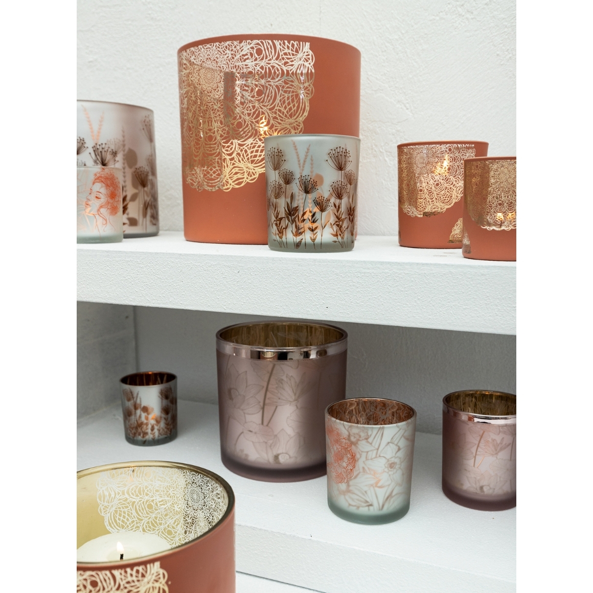 Made of glass with a floral pattern. The pattern is golden and gives a beautiful light effect.
