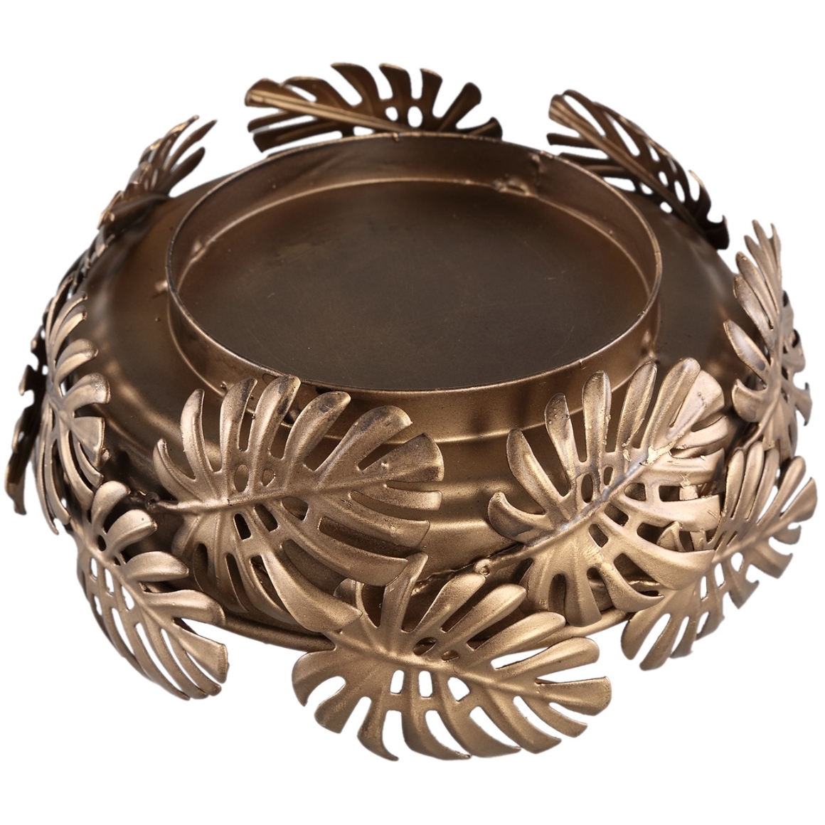 The gold-coloured hurricane lamp is made of metal and has a unique design.