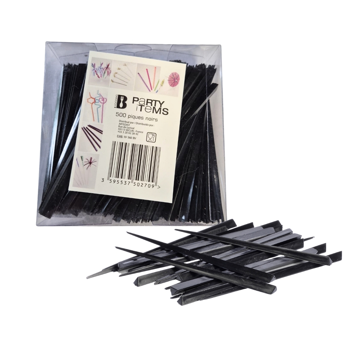 Set of 500 black plastic cocktail picks with a pointed shape. Perfect for serving appetizers, tapas and snacks at parties and events. Made from food-safe material and reusable, making them ideal for both catering and home use.