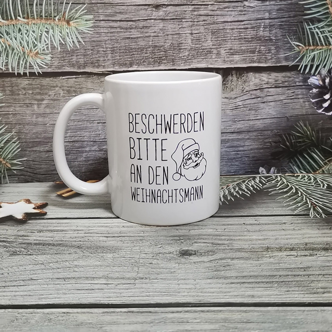 This white mug with the print Beschwerden bitte an den Weihnachtsmann has a capacity of 350 ml. Made of sturdy ceramic and suitable for hot and cold drinks. Perfect as a fun Christmas gift or for everyday use during the holidays.