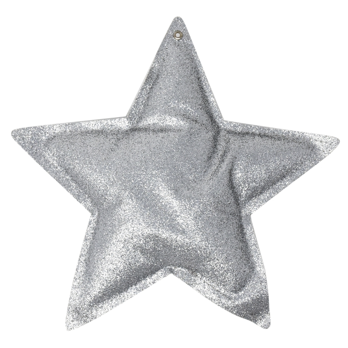 Decorative Christmas hanger shaped like a star with a metallic silver-coloured glitter finish. The star measures 18 cm in diameter and features a suspension eye for easy hanging. Ideal as a striking accent in Christmas trees, windows or festive wall displays.