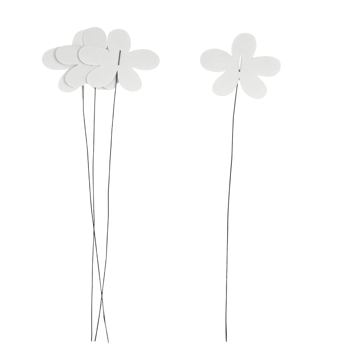 Set of 4 decorative flowers on a 38 cm iron wire pick. The flowers are made of white paper and attached to a flexible wire that can be shaped as desired. Ideal for floral arrangements, gift wrapping or creative decoration projects.