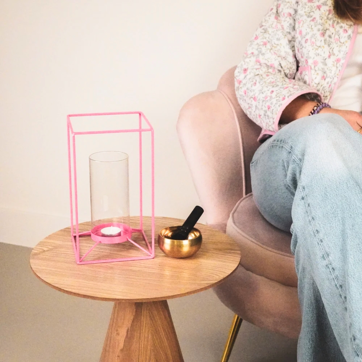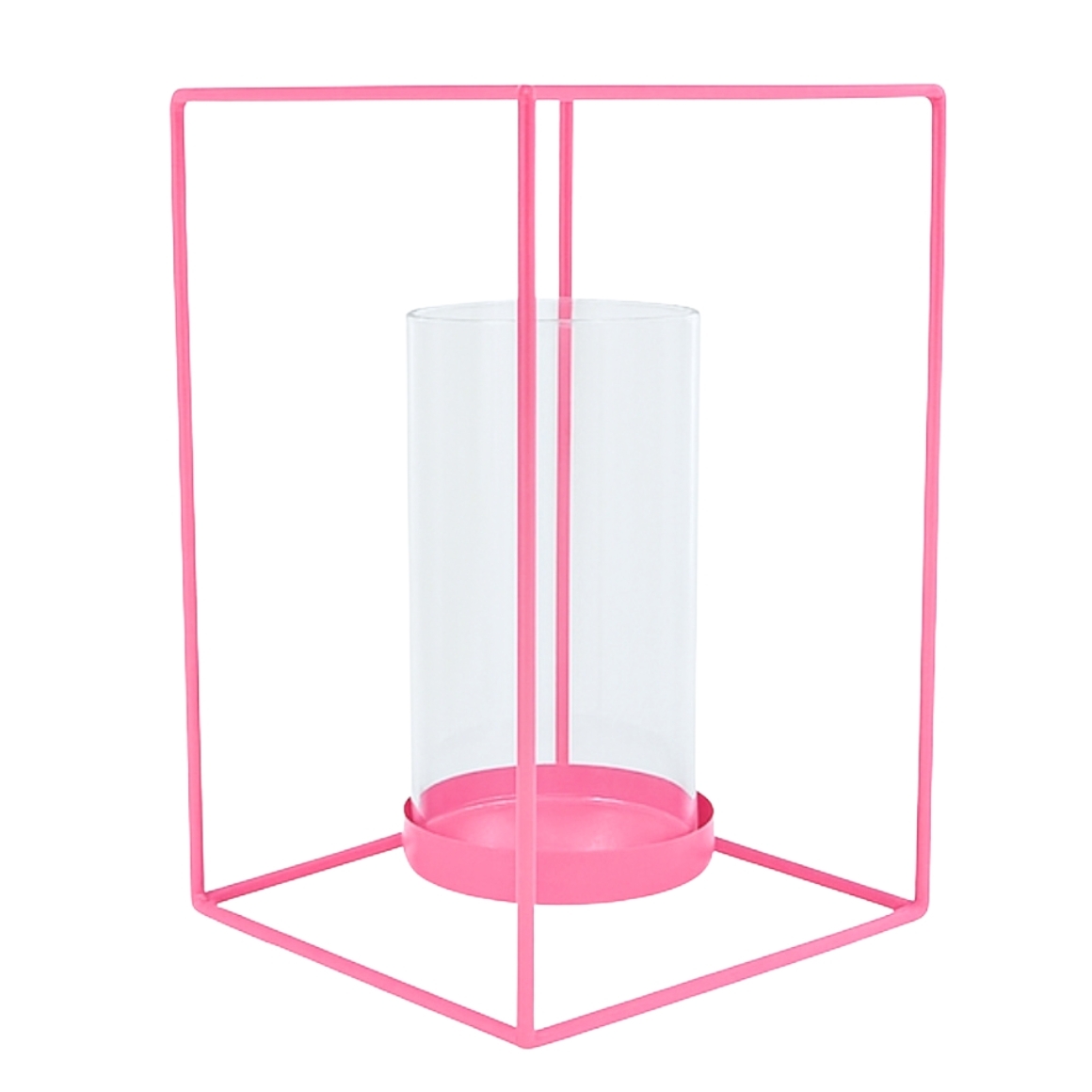 Housevitamin metal lantern in bright pink colour with modern look. The lantern is 25 cm high and features a separate glass insert for tea lights. Suitable for use on a table, windowsill or terrace and provides an atmospheric, warm light.