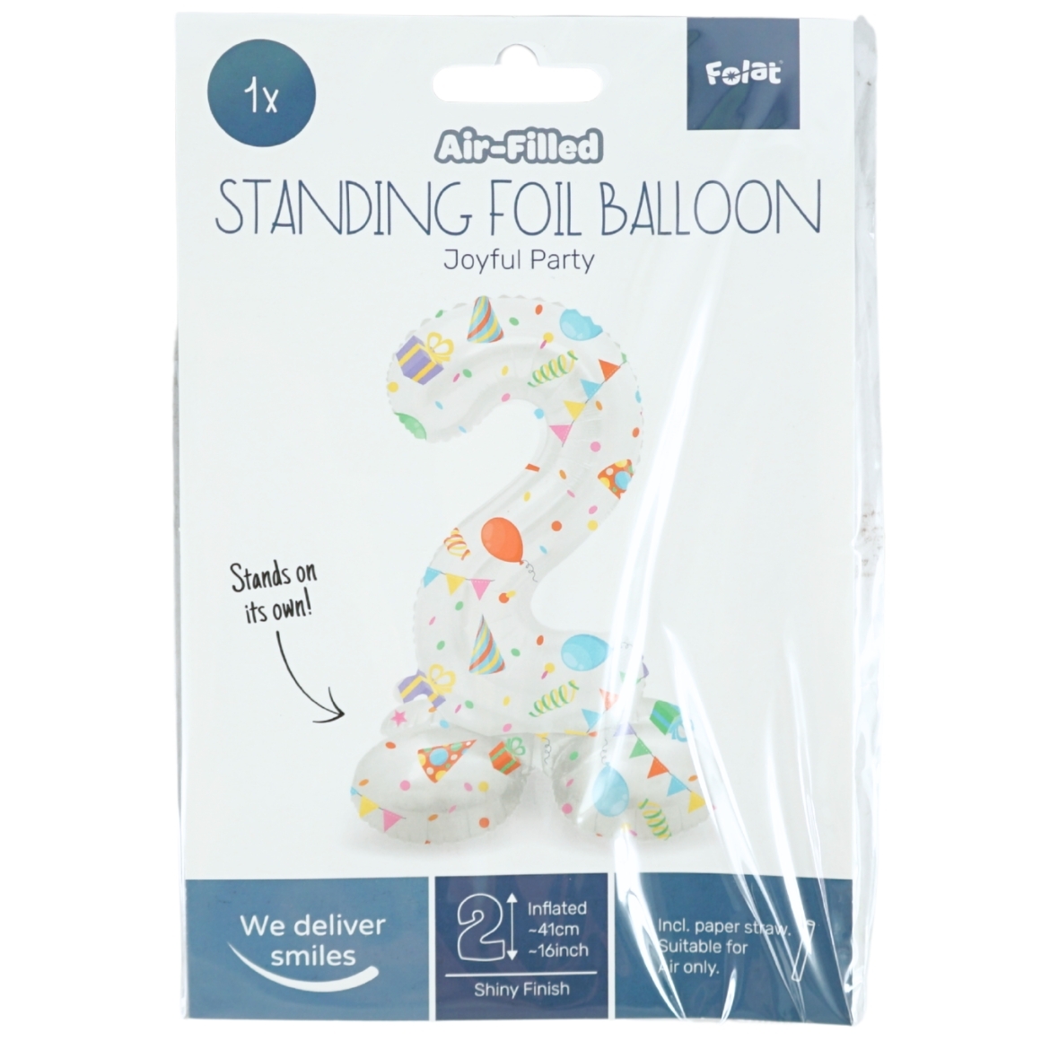 The Folat standing foil balloon Joyful Party (41 cm) is ideal for birthdays and party decorations. The balloon comes flat and can be easily filled with air via the paper straw provided. Made of foil, not suitable for helium or use with a compressor.