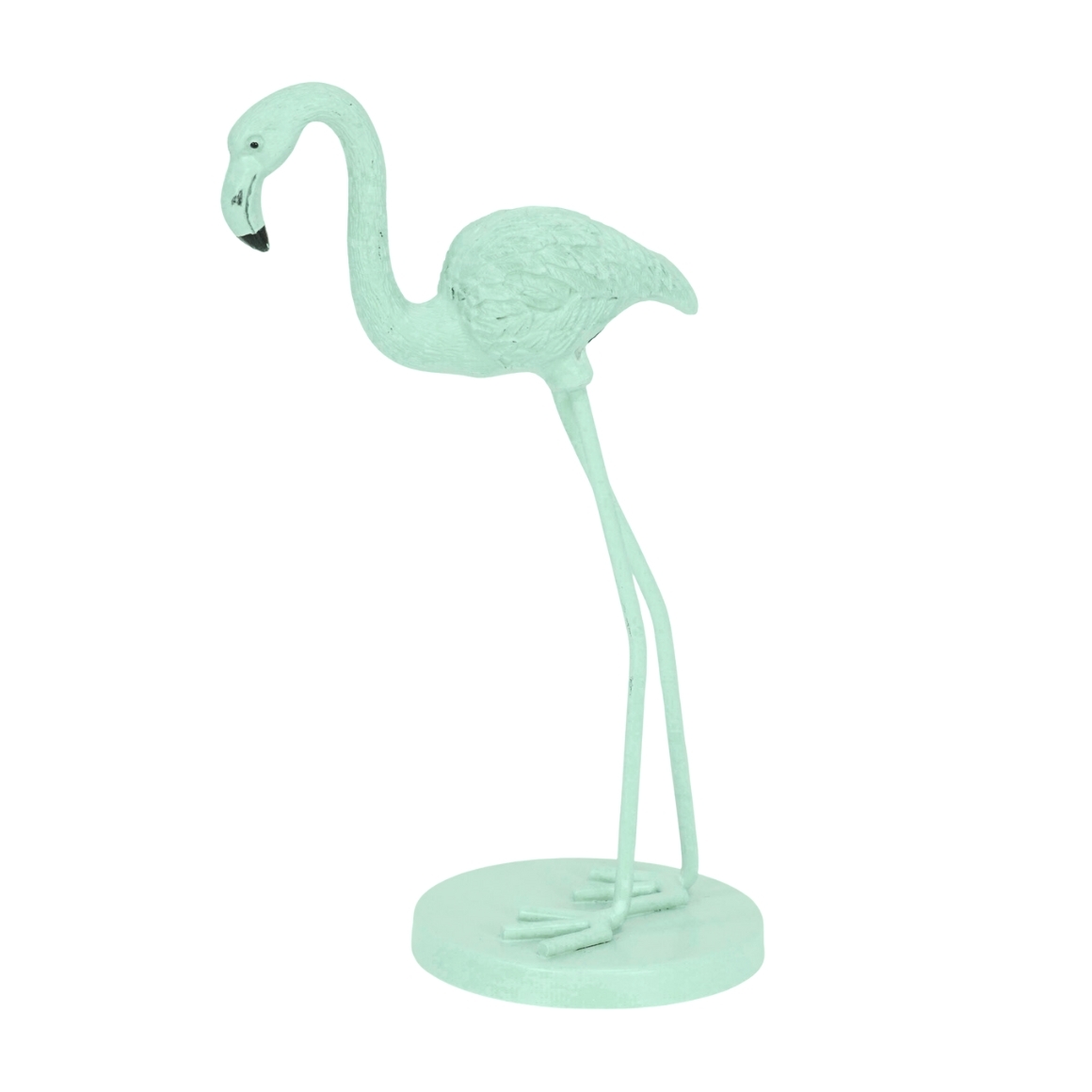 Decorative flamingo-shaped ornament made of polyresin. This model by Housevitamin comes in mint green. An elegant home accessory adding a stylish accent to any interior. Perfect for decorating a shelf, sideboard or windowsill.