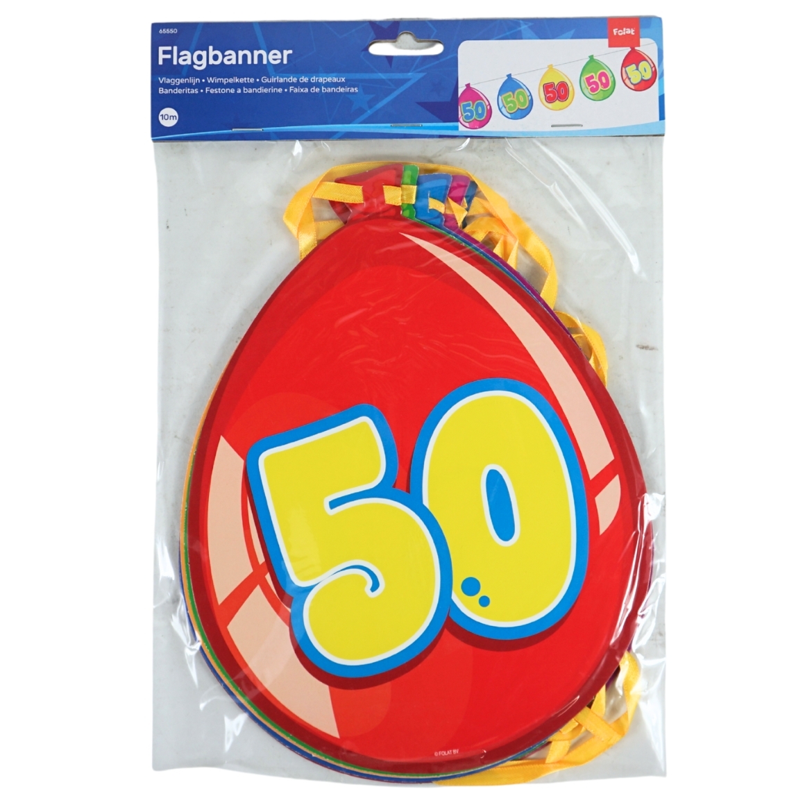 Colorful Folat flag banner with the text 50 years, perfect for a festive birthday celebration. Double-sided print with 15 balloon-shaped flags. Made of paper, 10 meters long and 25 cm high. For indoor use only.