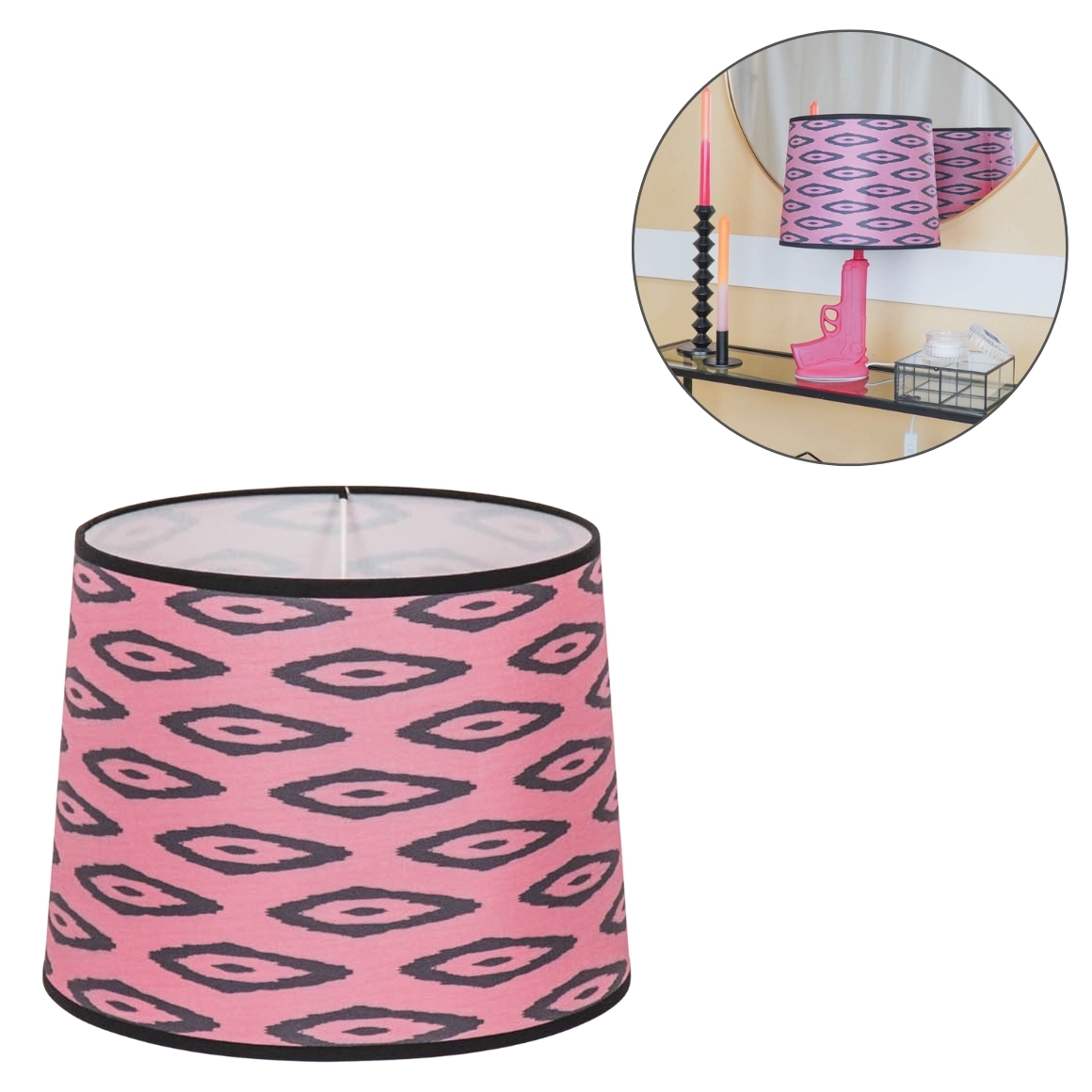 This lampshade from Housevitamins Kelim series is made of polyester and features a striking graphic design. The shade is suitable for an E27 socket and comes without a base or light source. Ideal for revamping your interior with a contemporary style.