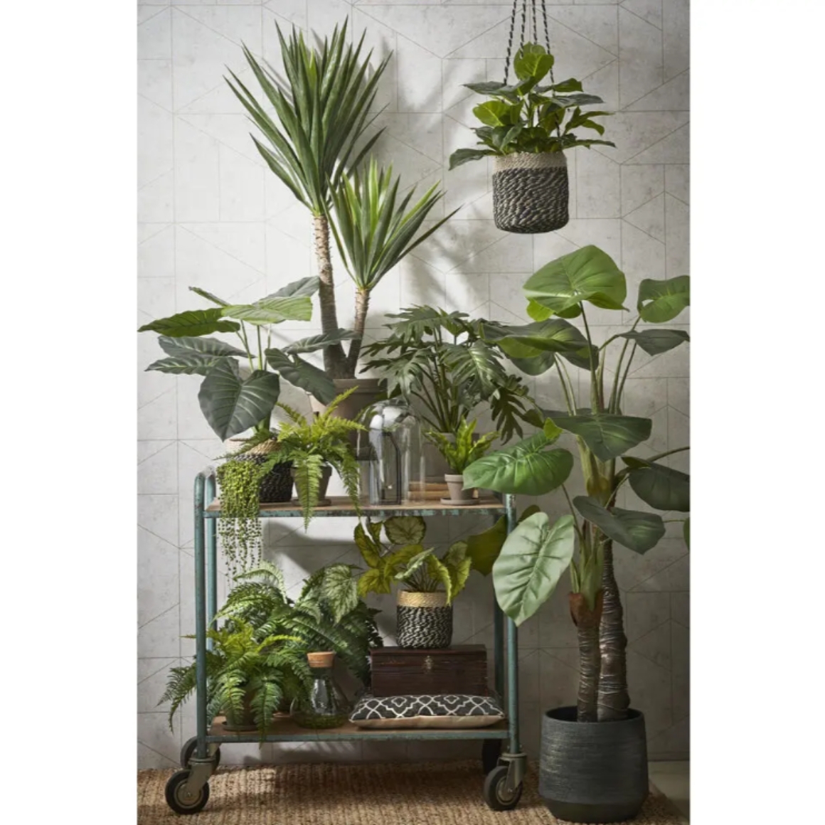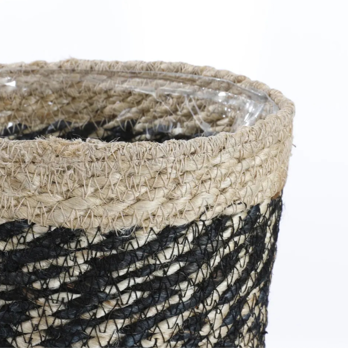 Woven jute basket from the Mica series Bonaparte in black/beige design. Fitted with a plastic inner pot to prevent leaking. Suitable as plant basket or decorative element. The natural look fits perfectly in a botanical interior.