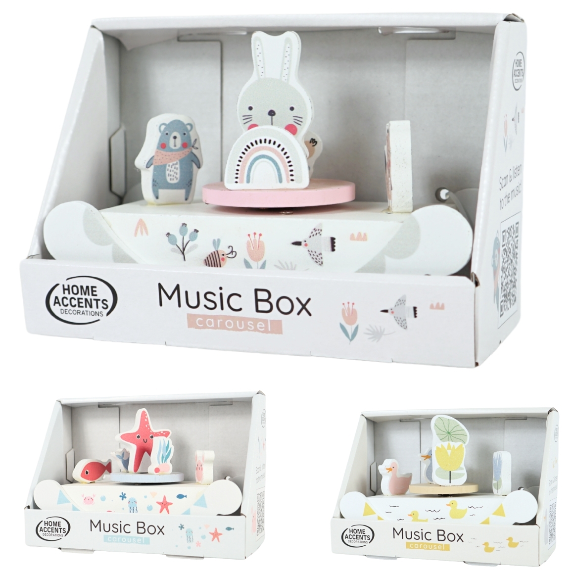 Item is supplied assorted, price per piece. Wooden music carousel from Home Accents that must be manually wound to play music. Suitable as a seasonal item or decorative accent in displays and presentations. The soft colors and playful details create an atmospheric appearance.