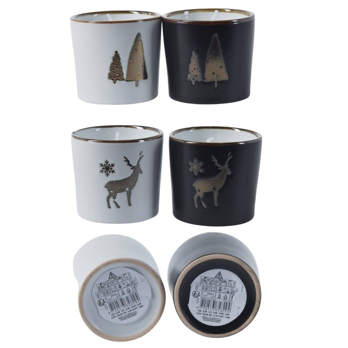 Item is supplied assorted, price per piece. Christmas candle in ceramic pot with gold-coloured rim. Available in black or white and in two Christmas designs: reindeer or tree. Size 6.5 x 6 cm. A charming accent for the festive season on a table, windowsill or sideboard.