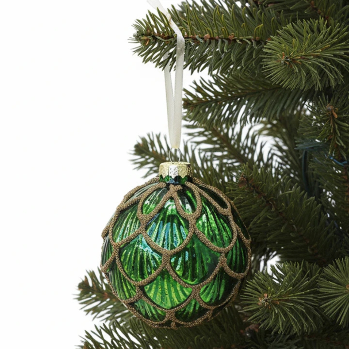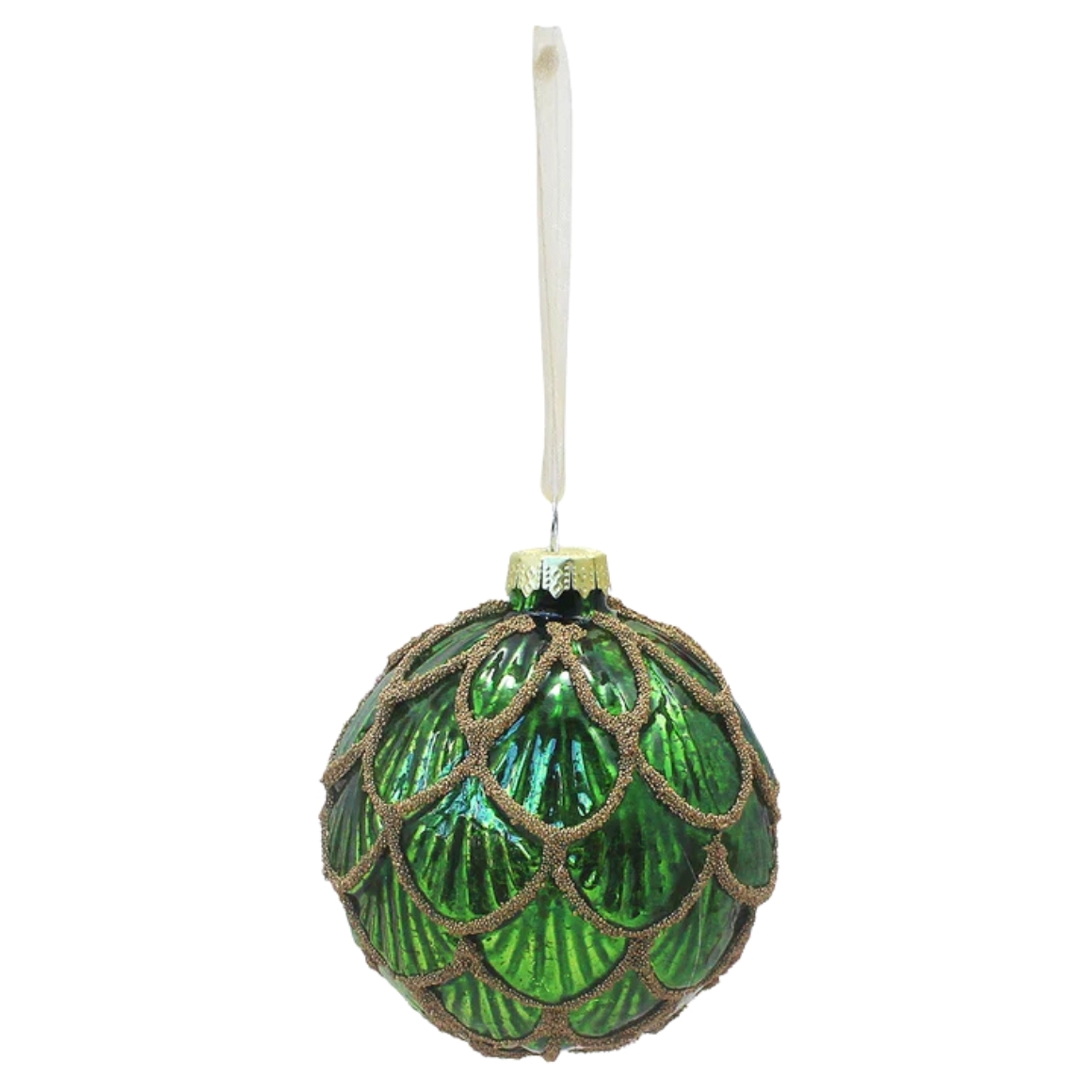 Glass Christmas bauble with pinecone pattern and gold-coloured edges. The green shade adds an elegant look. Comes with a hanging ribbon of approximately 8 cm, perfect for a stylish tree decoration.