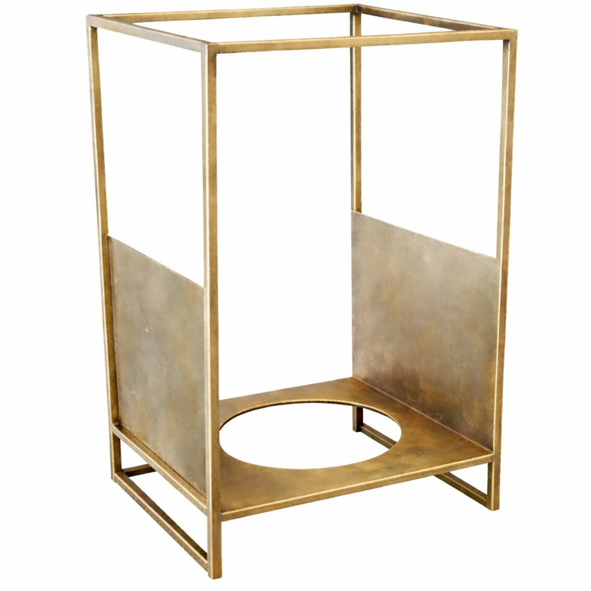 Metal flower pot holder with a square frame and gold-coloured finish. The open construction and clean lines create a modern look. Features an opening of approx. 11.5 cm for a pot. Ideal for elevating plants and suitable for various creative interior decoration ideas.