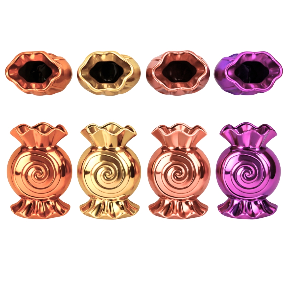 Item is supplied assorted, price per piece. Candy Spiral metallic vase by Daan Kromhout, 20 cm high and available in 4 metallic colours. The ceramic candy shaped design with spiral relief and glossy finish creates a striking look. A decorative statement piece that adds a playful and modern touch to any interior. Suitable for small floral arrangements or as an object, ideal for year round use.
