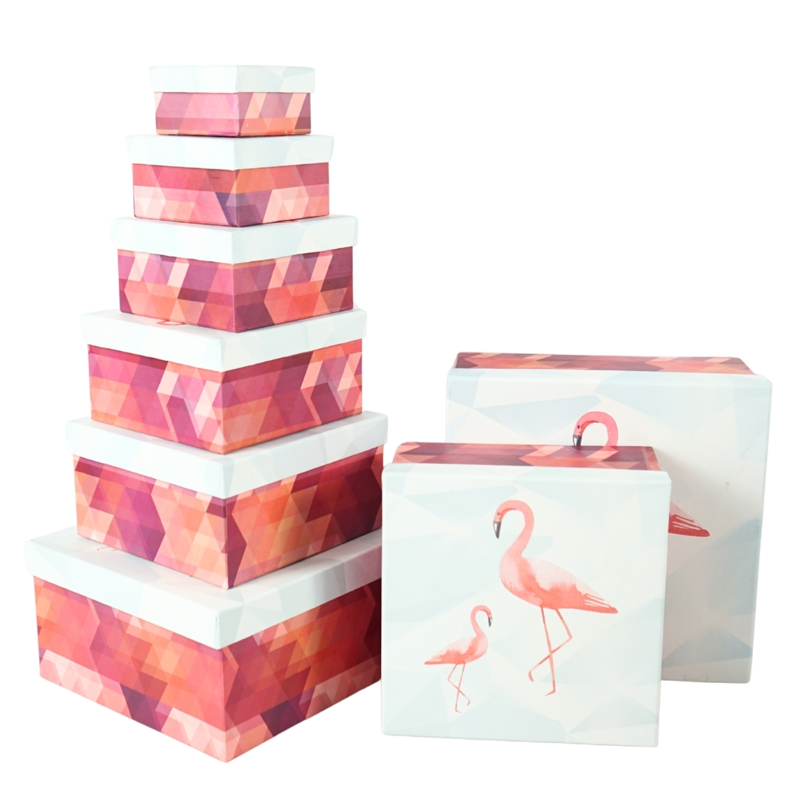 Item is supplied assorted, price per piece. Set of 8 cardboard gift boxes from Noor Living in tropical design with various prints. Suitable for packing gifts, accessories and small items. The largest box measures 22 x 22 x 11 cm and the smallest 7,5 x 7,5 x 4,5 cm. Practical for presentation and storage.