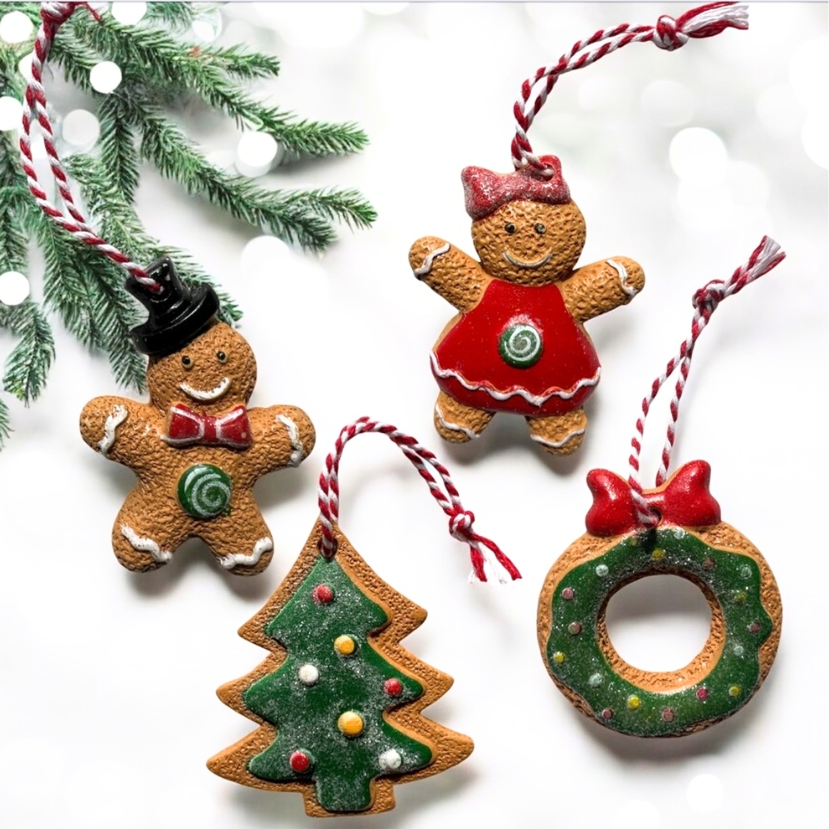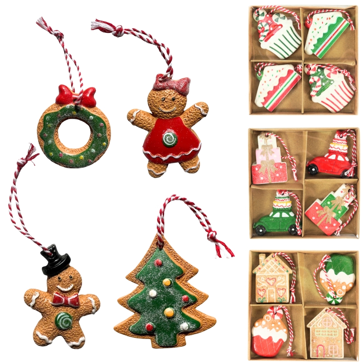 Item is supplied assorted, price per piece. Set of 4 Christmas hangers made of polyresin in various Christmas themes, such as gingerbread figures, gift boxes with car, cupcakes and houses. Equipped with red white hanging cord and suitable for Christmas tree, wreath or other decorative use. Size approx. 6 cm per hanger.