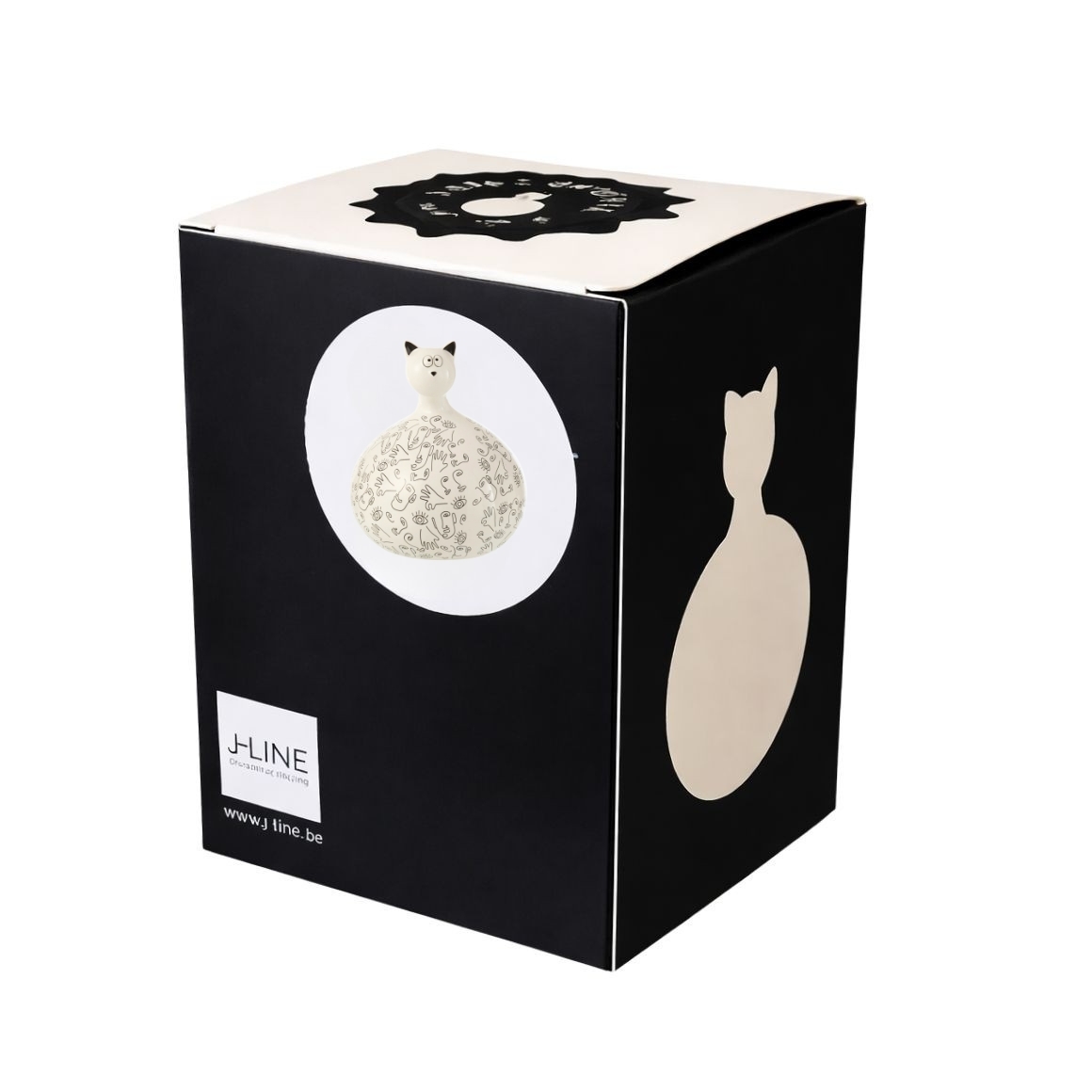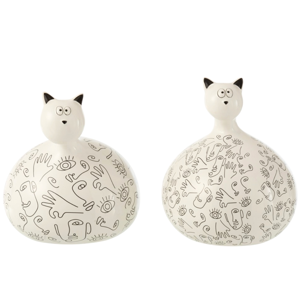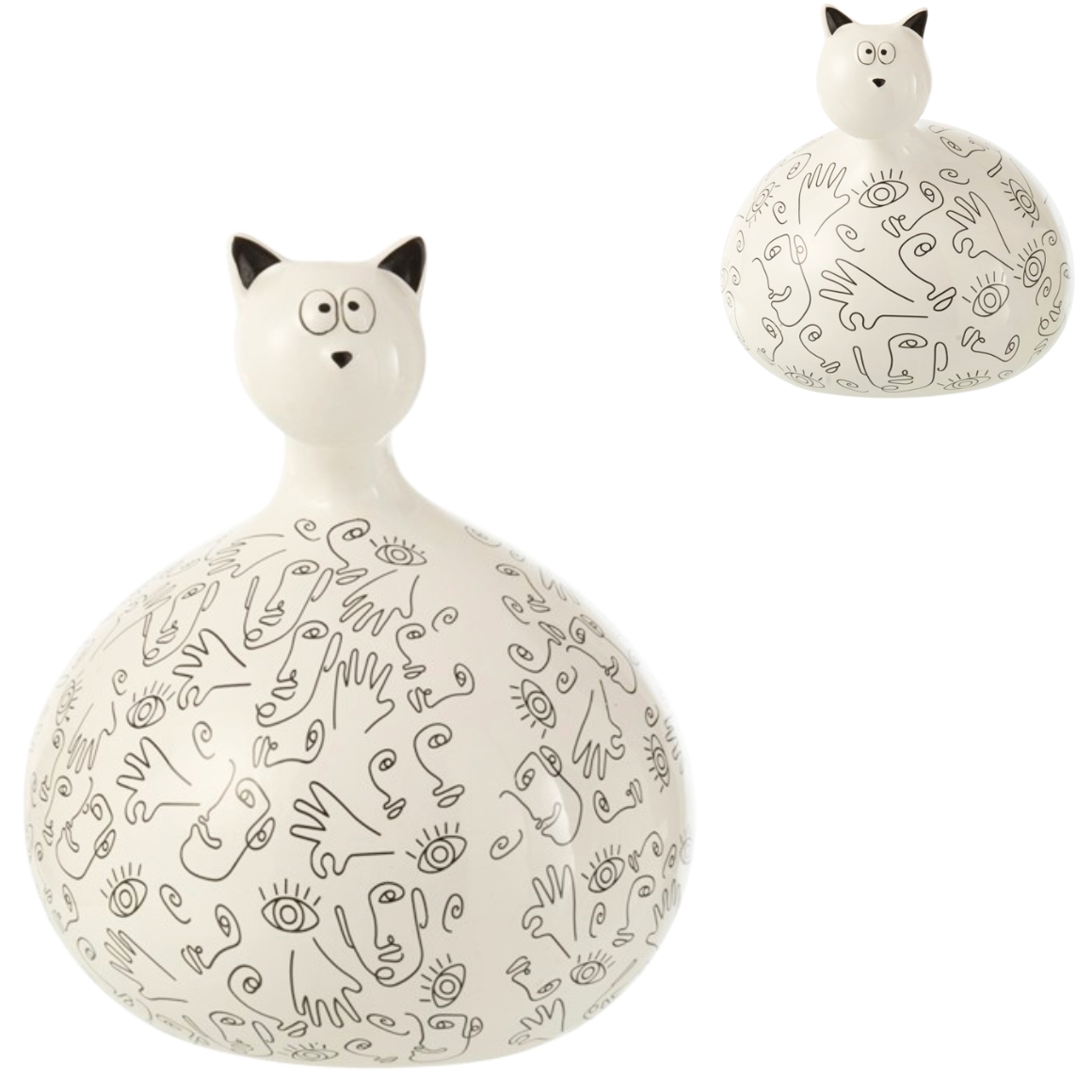 Item is supplied assorted, price per piece. Decorative ceramic statue of a cat with a rounded shape and graphic line pattern of faces and hands. The modern black and white design gives the statue a playful artistic look. The two models differ in pattern and details. Nice as decoration on a shelf, cabinet or sideboard and also suitable as a gift. Height about 22 cm.