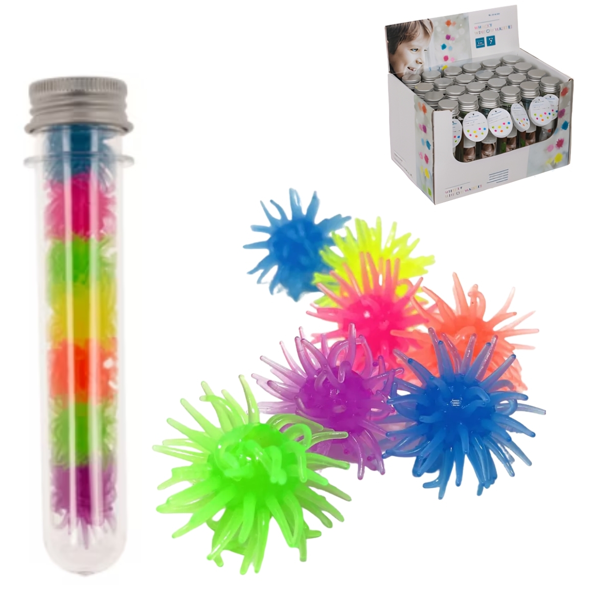 This Out of the blue window walkers set of 7 pieces of 3 cm provides fun on smooth surfaces. Throw the window walkers against a window or wall and watch them slowly walk down. The set consists of multiple colours and is suitable as a small toy or giveaway item.