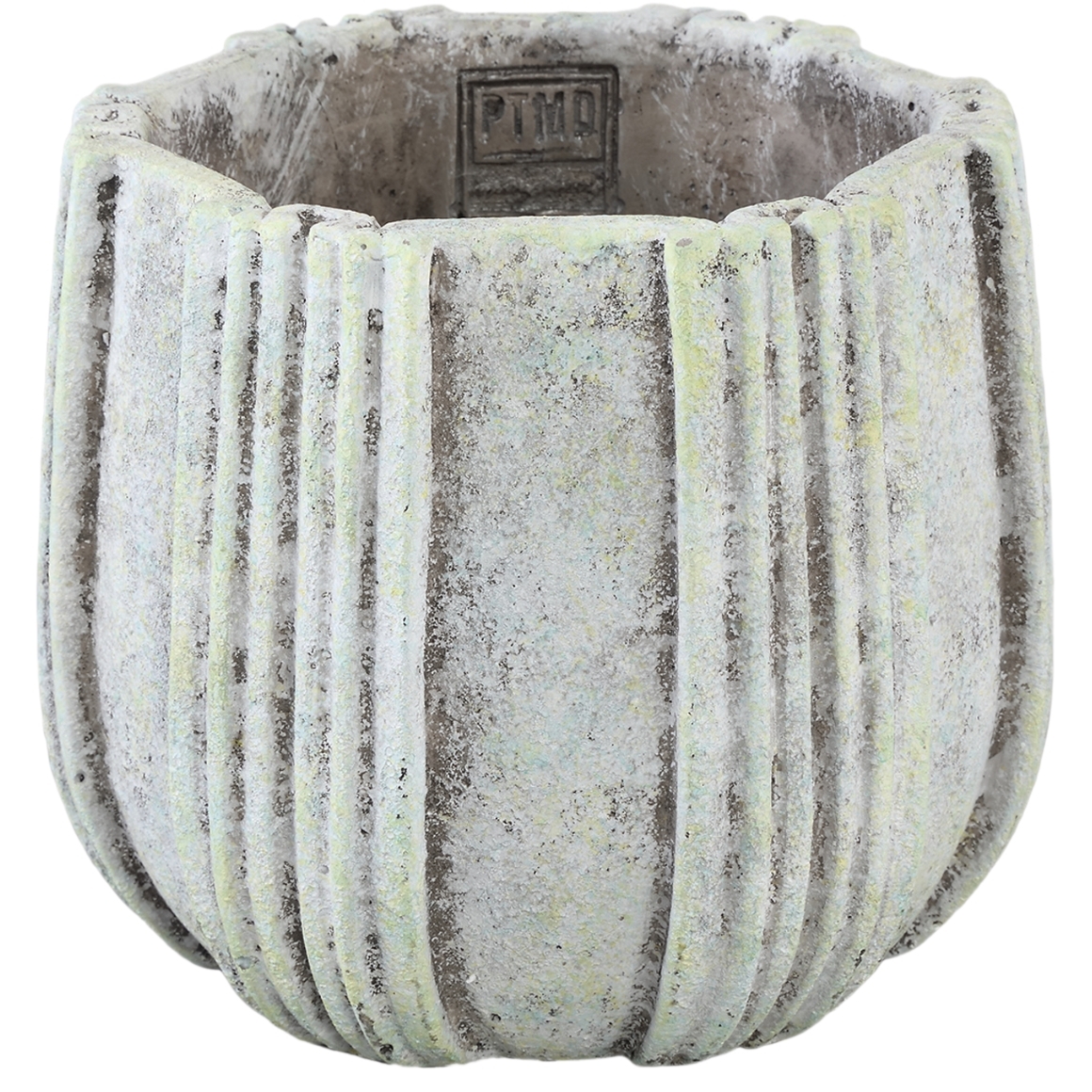 Pot de fleurs de PTMD de la série Valerio, un pot de ciment décoratif avec une finition vieillie. La structure nervurée verticale et la forme ronde confèrent au design un aspect robuste et élégant.