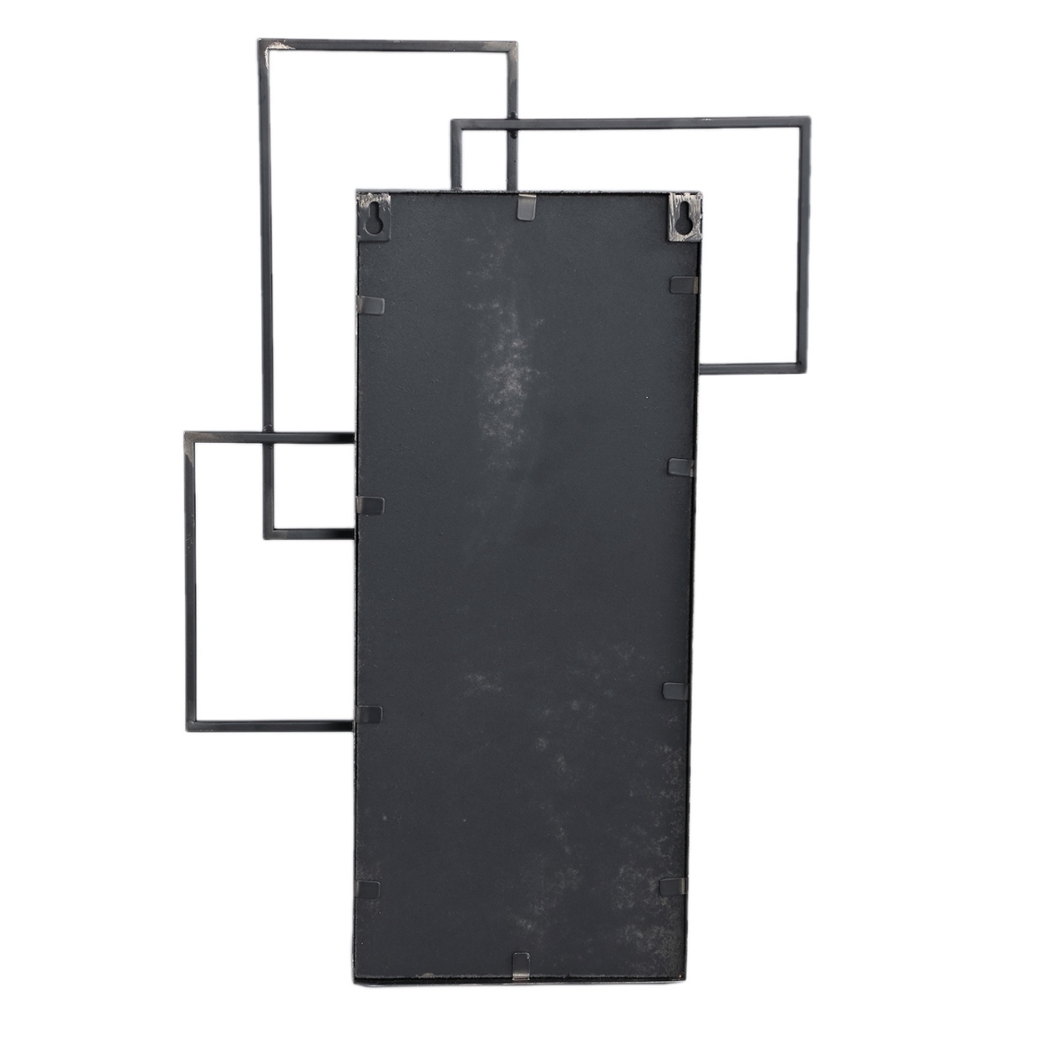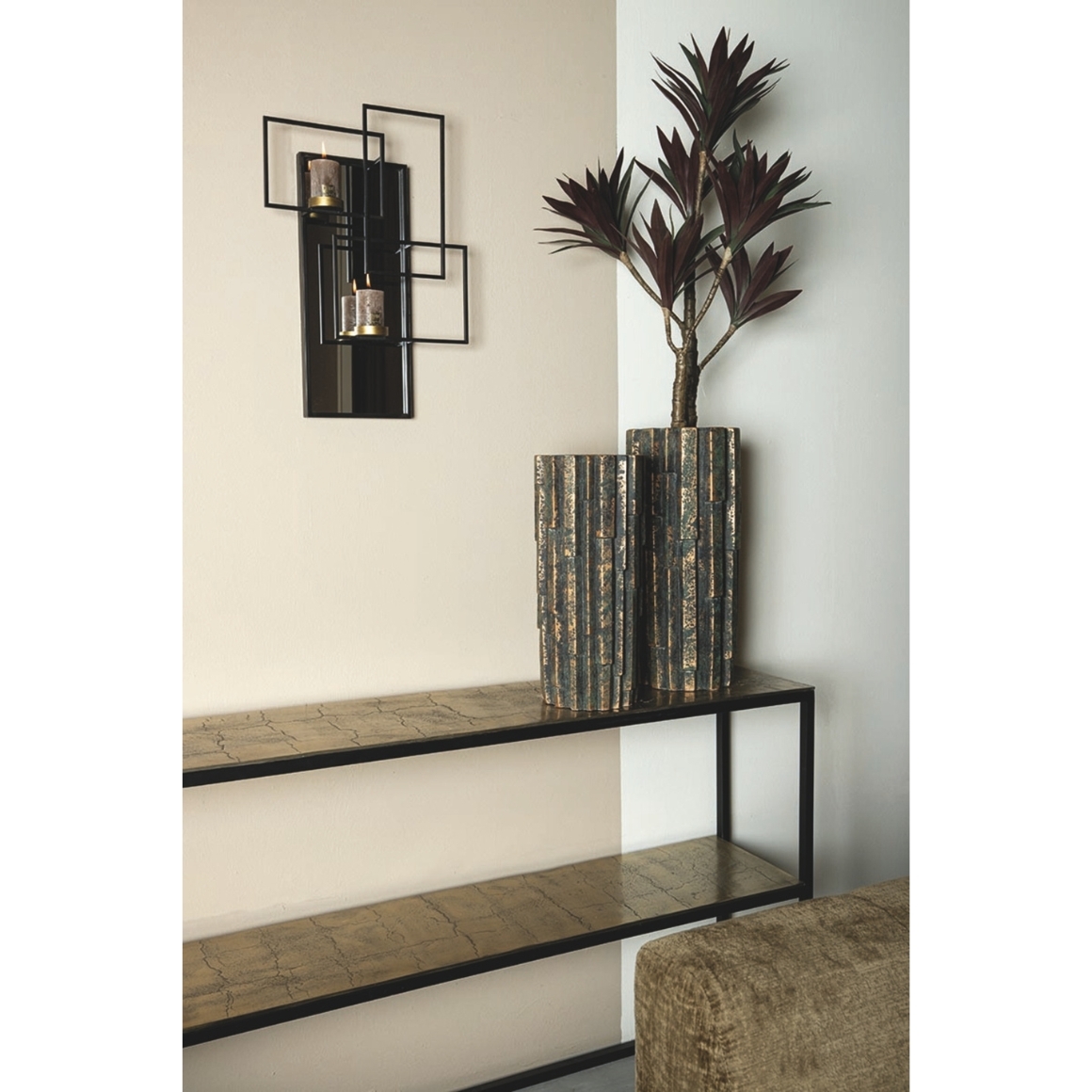 Ce photophore mural de PTMD séduit par son design géométrique et sa fonctionnalité. La structure en métal noir intègre deux supports dorés avec verres pour bougies chauffe-plat. Le fond miroir accentue l’effet lumineux pour une ambiance chaleureuse. Avec une hauteur d’environ 54 cm, cette étagère murale attire immédiatement le regard. Dotée d’un œillet de suspension à l’arrière pour une fixation facile.