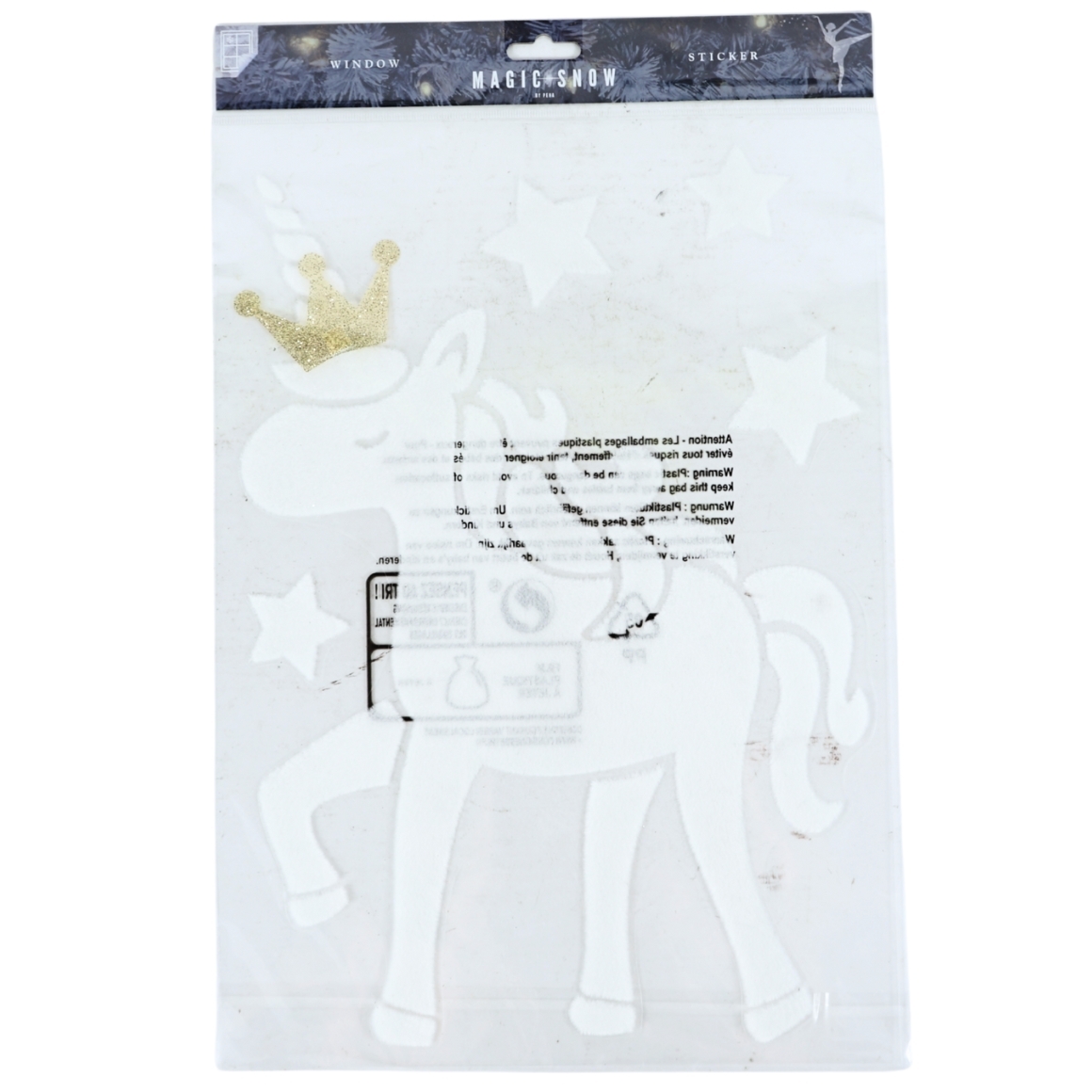 Décorez vos fenêtres avec cet autocollant de fenêtre licorne de 40 cm. Le motif montre une licorne avec une couronne couleur or et des étoiles, idéal pour une décoration magique et festive. Convient aux surfaces lisses comme le verre ou les miroirs. Réutilisable, facile à poser et à retirer sans traces.
