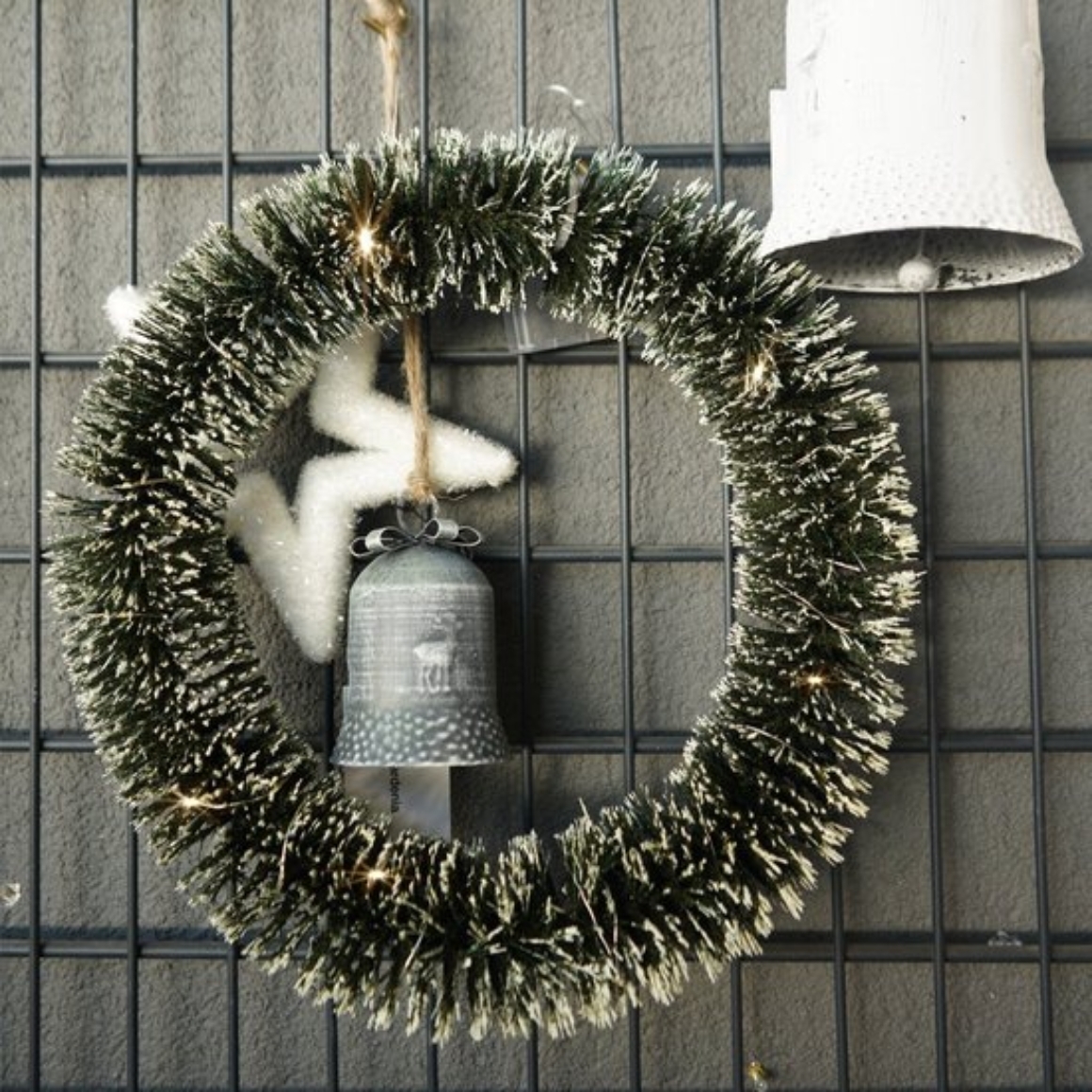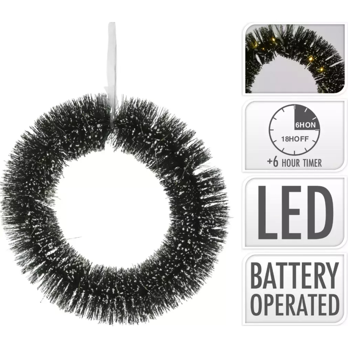 Couronne de Noël artificielle décorative avec effet de neige et 30 lumières LED blanc chaud. Munie dun oeillet de suspension et dune fonction minuterie (6 h allumé, 18 h éteint). Fonctionne avec 3 x piles AA (non incluses). Diamètre 40 cm.