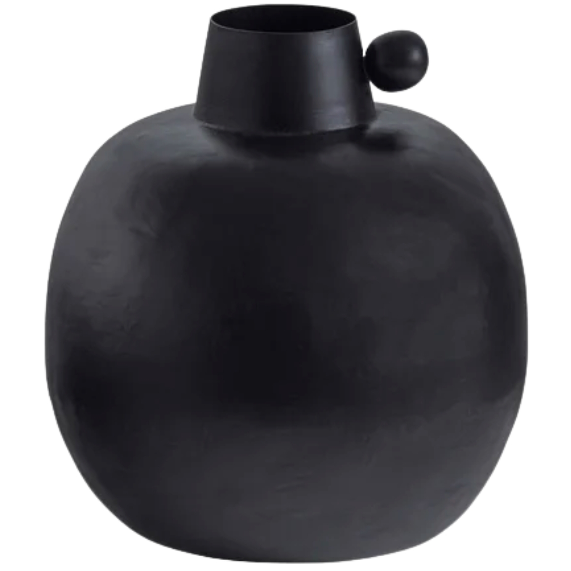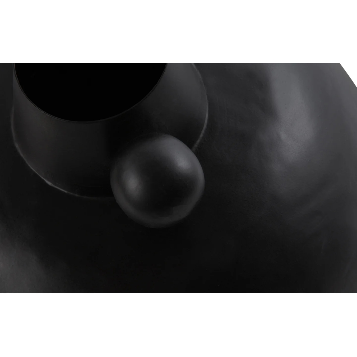 Vase décoratif en métal avec finition noire mate. Le design rond et organique avec anse ludique fait de ce vase un élément décoratif remarquable dans tout intérieur. Convient pour les fleurs séchées ou comme accent seul sur une table ou une étagère.