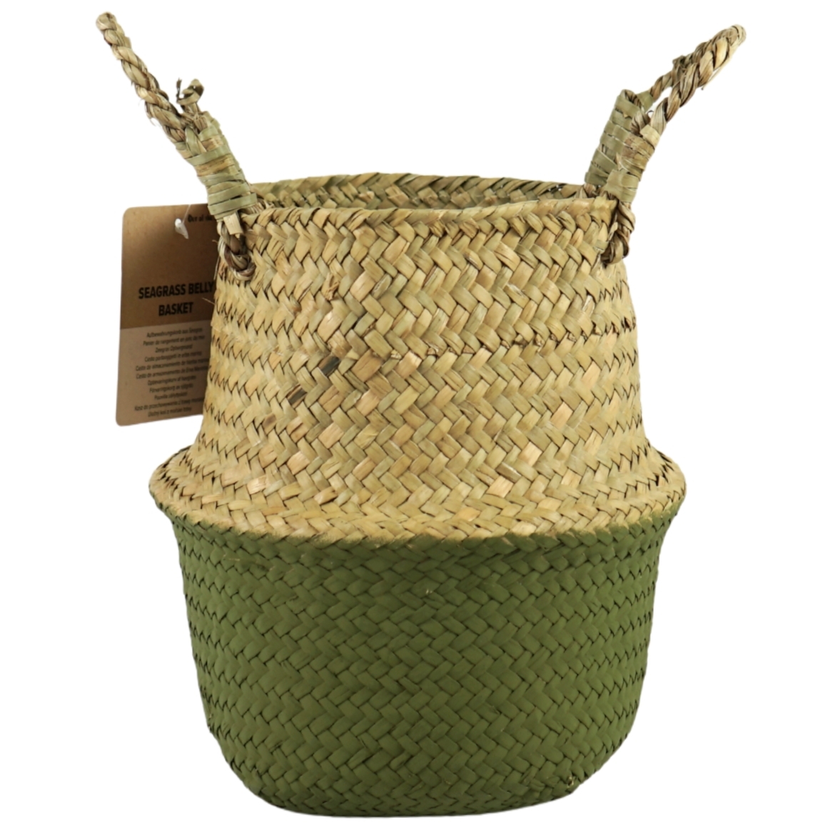 Panier décoratif en jonc de mer tressé avec une couleur brune naturelle et une base peinte en vert olive. Équipé de deux poignées et polyvalent pour un usage domestique. Dimensions environ 18 x 18 x 22 cm. Gardez le panier à lécart du feu et ne lutilisez pas pour des aliments non emballés.